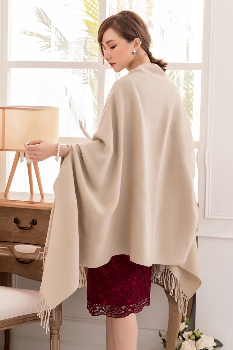 暖かさとおしゃれを叶える、袖穴付きストールです。両端にフリンジ付きで、羽織った時のさりげないポイントに。ノーカラー・ノーボタンの前開きデザインで着脱しやすく、袖穴付きで動いてもずり落ちづらいのが魅力です。コート感覚でふわっと羽織って肩や背中を暖かく守ってくれます。コートを着るほどではなく季節の変わり目などにぴったりで、通勤・通学やデート・お出かけなど様々なシーンで活躍します。