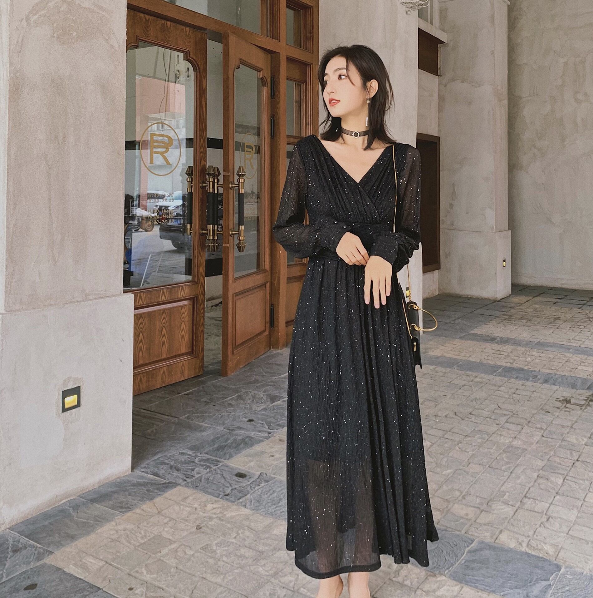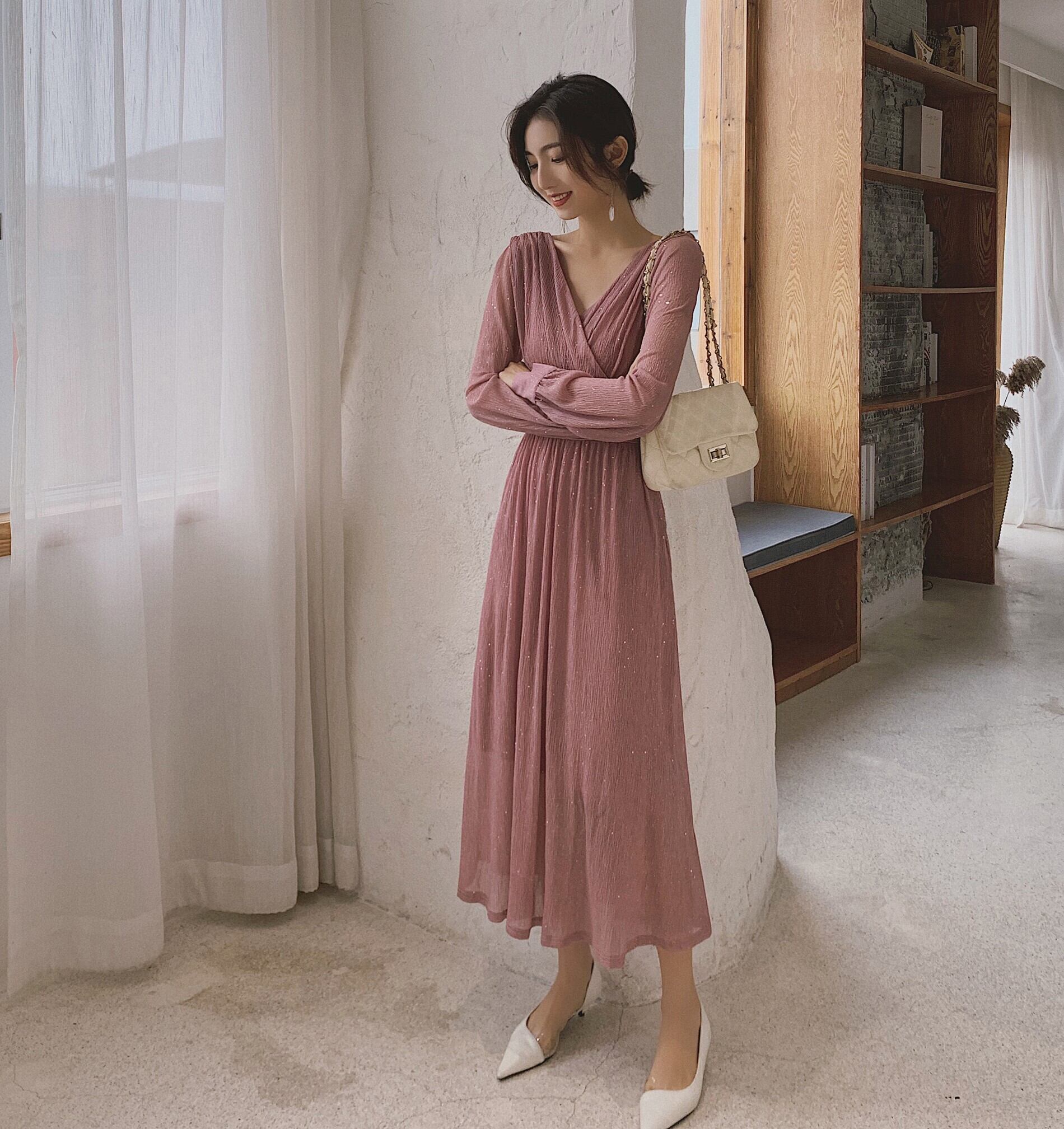 裾シアー レディース ワンピース ドレス ウエストシェイプ スマート 細身 Aライン 膝下 ミモレ ロング 短め裏地 長袖 ラメ感 Vネック カシュクール 襟なし 背中開き Vバック バックコンシャス ハイウエスト ウエストギャザー 透け感 シースルー きれいめ シンプル おしゃれ エレガント 抜け感 セクシー 女っぽ 色気 無地 春 夏 秋 女の子 パーティー イベント 韓国 オルチャン コーデ 体型カバー 脚長 モテ インスタ映え 着痩せ S M L 赤 レッド ドライローズパープル 黒 ブラック