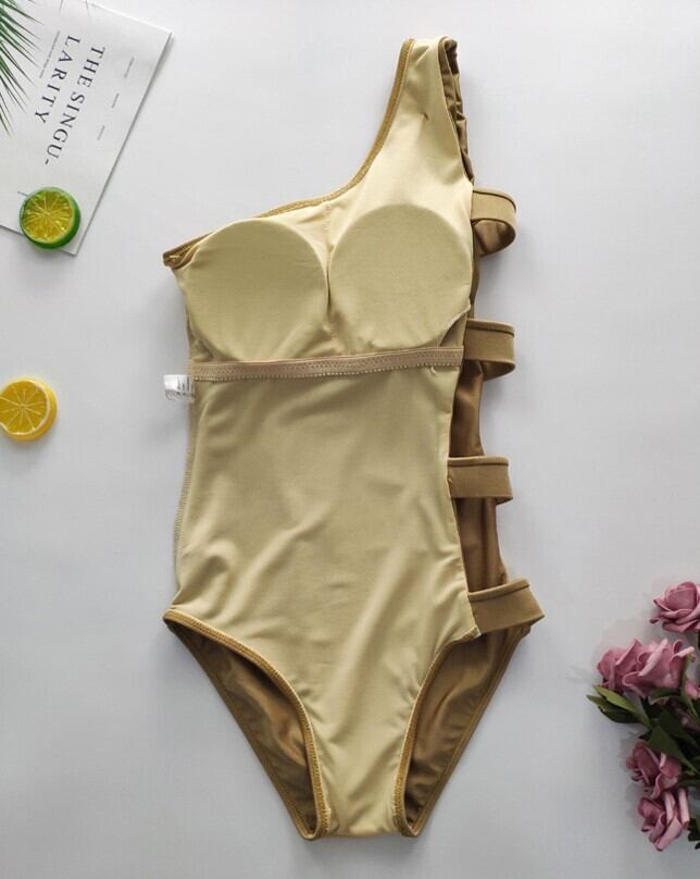 水着 レディース ワンピース ワンショル ノンワイヤー パッド付き ボタン 大人可愛い きれいめ ゴージャス 華やか 大人っぽい おしゃれ お洒落 主役級 存在感 ガーリー クール モード系 かっこいい セクシー トレンド 無地 リゾート 旅行 温泉 プール 夏 海 美脚 脚長 スタイルアップ 韓国 モテ インスタ映え 大きい S M L XL ブラック カーキ