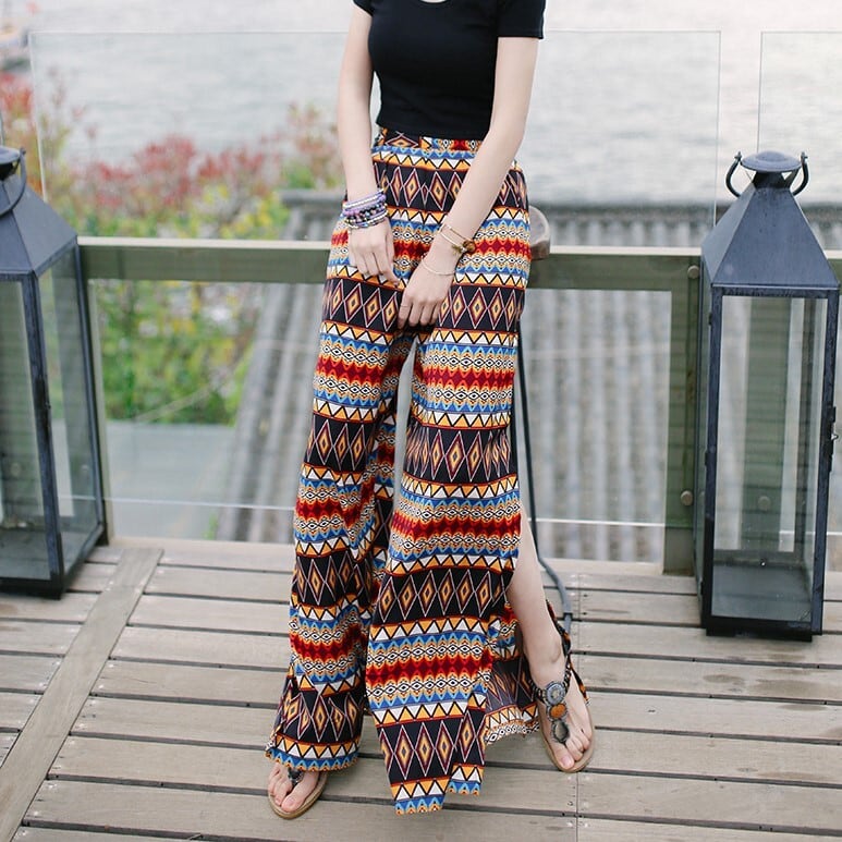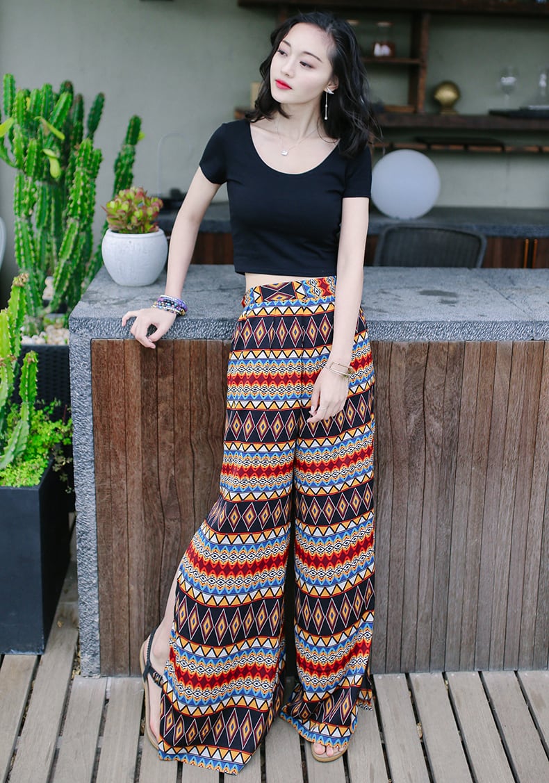 ボヘミアン調プリントのワイドレッグパンツです。サイドにスリットが入っている抜け感のあるデザインで、裾が軽く広がって見えます。幾何学調の横縞パターンが個性的でエスニックなスタイリングを演出。着こなしの主役になり、いつものトップスをぱっと明るく存在感のある着こなしにアップデートできます。リゾートシーンや夏のお出かけなどにぴったりのアイテムです。
