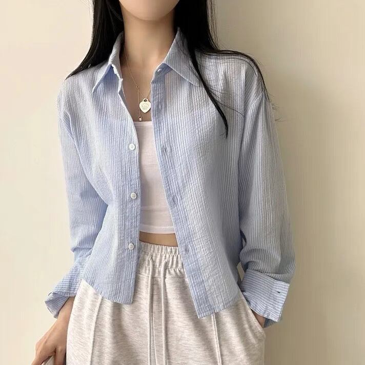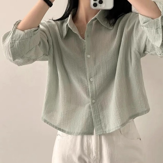 レディース トップス シャツ 上着 羽織 前開き ショート 長袖 襟付き フェミニン ハイウエスト コンサバ ボタン アメカジ 薄手 大人可愛い きれいめ シンプル カジュアル 上品 おしゃれ レトロ こなれ感 ラフ 抜け感 キュート クラシカル カレッジ風 学生風 ベーシック アメリカン ナチュラル ストライプ 春 夏 秋 母の日 授業参観 ママ 学生 お出かけ リゾート 公園 ショッピング 韓国 コーデ 普段使い 着回し ロールアップ フリーサイズ 白 ホワイト ピンク ブルー アプリコット グリーン