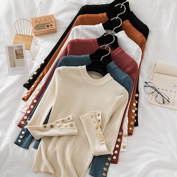 リブニット レディース トップス セーター ニットソー スリム 細身 タイト すっきり ミディアム 長袖 ラウンドネック 襟なし ノーカラー 袖口スリット ゴールドボタン スナップボタン ストレッチ 伸縮性 きれいめ シンプル カジュアル 上品 おしゃれ こなれ感 ベーシック 無地 春 秋 冬 ママ 女の子 OL 通勤 学生 学校 通学 デート お出かけ 旅行 お花見 合コン コンパ カフェ 普段使い 着回し フリーサイズ ホワイト ブラック イエロー ベージュ カーキ ピンク ブルー グリーン レンガ色