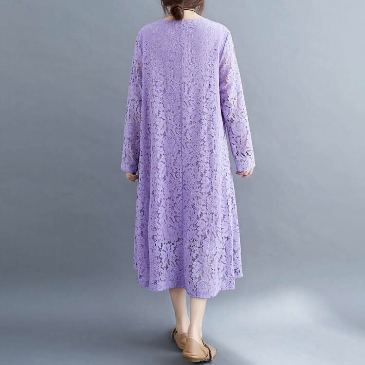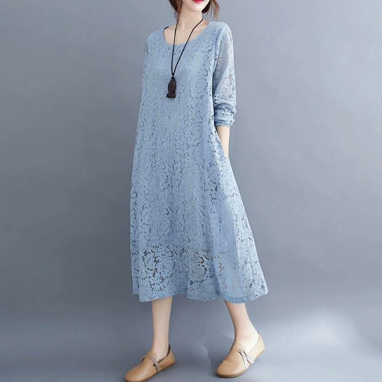 レディース ワンピース 長袖 ラウンドネック ミモレ丈 レース 透け感 Aライン プルオーバー ハイウエスト ルーズ きれいめ 上品 おしゃれ お洒落 大人可愛い 大人女子 シンプル カジュアル エレガント キュート ラブリー ガーリー フェミニン レトロ 主役級 存在感 こなれ感 抜け感 夏 10代 20代 お出かけ デート 女子会 休日 普段使い 韓国 オルチャン ファッション コーデ インスタ映え 脚長 M L XL 2XL 3XL ホワイト レッド ブラック ピンク パープル アプリコット ブルー