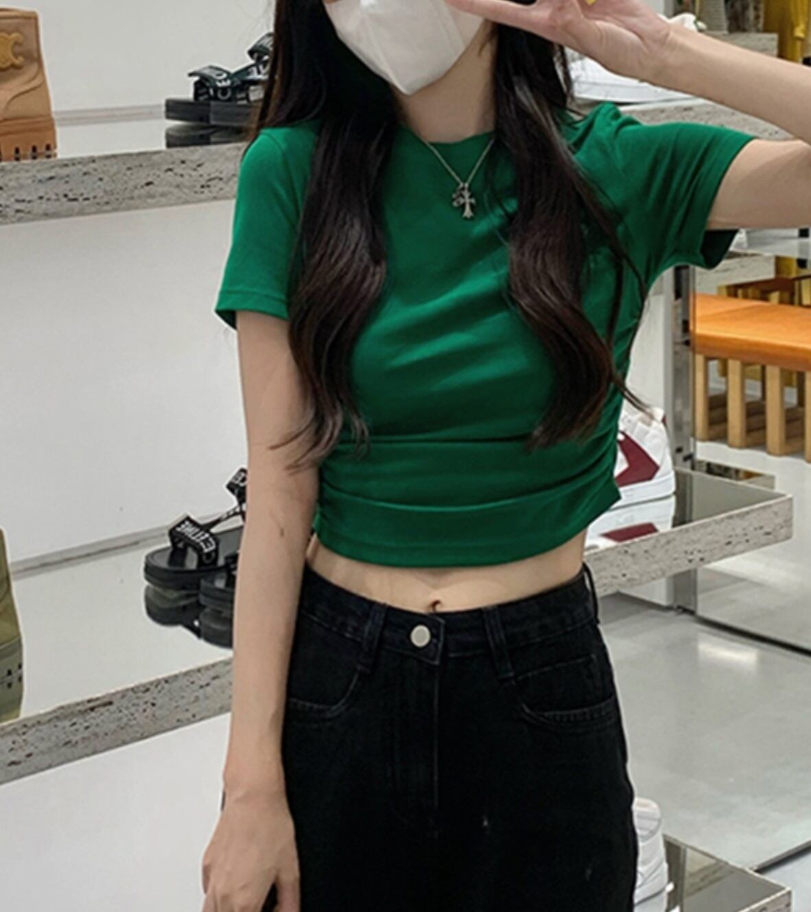ショート丈 半袖 Tシャツ レディース トップス カットソー プルオーバー インナー ショート ラウンドネック 襟なし スリム 細身 へそ出し かわいい 大人可愛い きれいめ シンプル カジュアル おしゃれ 無地 春 夏 秋 通勤 学生 学校 通学 デート お出かけ 旅行 公園 女子会 休日 ショッピング カフェ 重ね着 普段使い 着回し XS S M L XL 小さいサイズ 白 ホワイト 黒 ブラック グレー 緑 グリーン