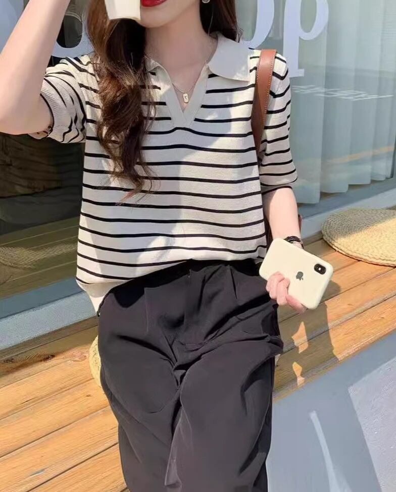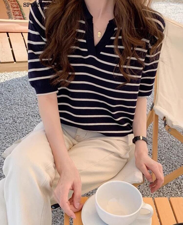 新作のレディースポロシャツが登場!襟付きのデザインで、おしゃれな印象を与える一枚です。ボーダー柄がさりげなく存在感を演出し、トレンド感も抜群。Vネックと角襟の組み合わせが、大人可愛い雰囲気を醸し出します。