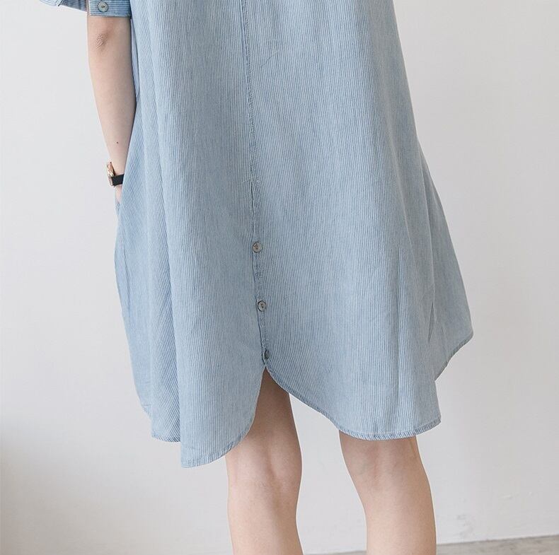 ストライプ柄 半袖 ミニ丈 シャツワンピース レディース ワンピース サマーワンピ ミニ 膝上 襟付き 角襟 ポロカラー フレア Aライン ドレープ タック タックプリーツ スリット バックスリット ボタン 綿 かわいい 大人可愛い シンプル カジュアル おしゃれ 主役級 ストライプ 春 夏 ママ マタニティ 通勤 学生 学校 通学 デート お出かけ 旅行 公園 女子会 休日 ショッピング カフェ 楽ちん 体型カバー 普段使い 着回し ゆったり フリーサイズ ブルー