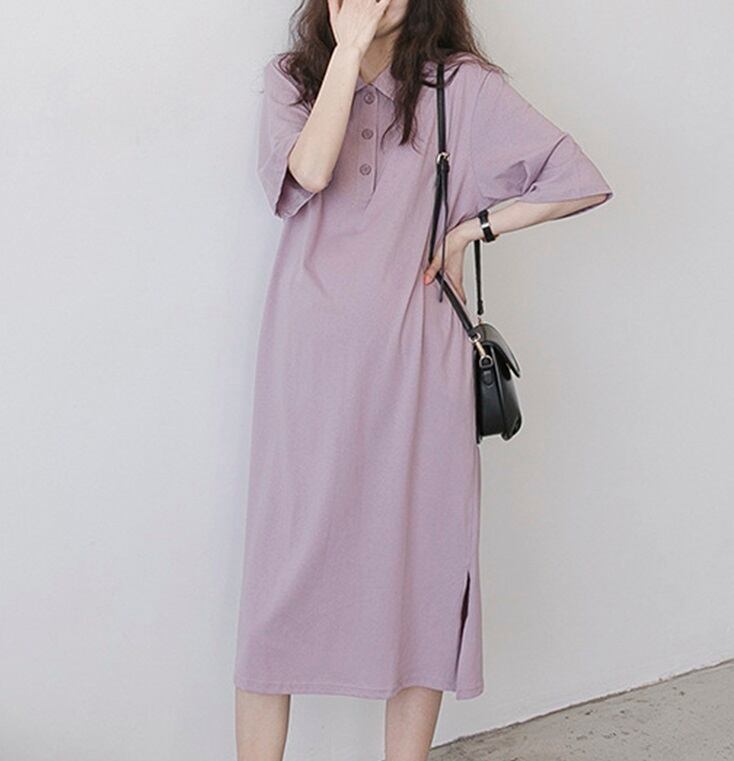 ミモレ丈 ポロシャツ ワンピース レディース ワンピース サマーワンピ 膝下 ミモレ 半袖 5分袖 襟付き 角襟 ポロカラー ワイド Iライン ドレープ スリット サイドスリット ポケット ボタン ハーフボタン かわいい 大人可愛い シンプル カジュアル おしゃれ こなれ感 ラフ ルーズ 無地 春 夏 秋 ママ マタニティ 通勤 学生 学校 通学 デート お出かけ 旅行 公園 女子会 休日 ショッピング カフェ 重ね着 楽ちん 体型カバー 普段使い 着回し ゆったり フリーサイズ 黒 ブラック パープル