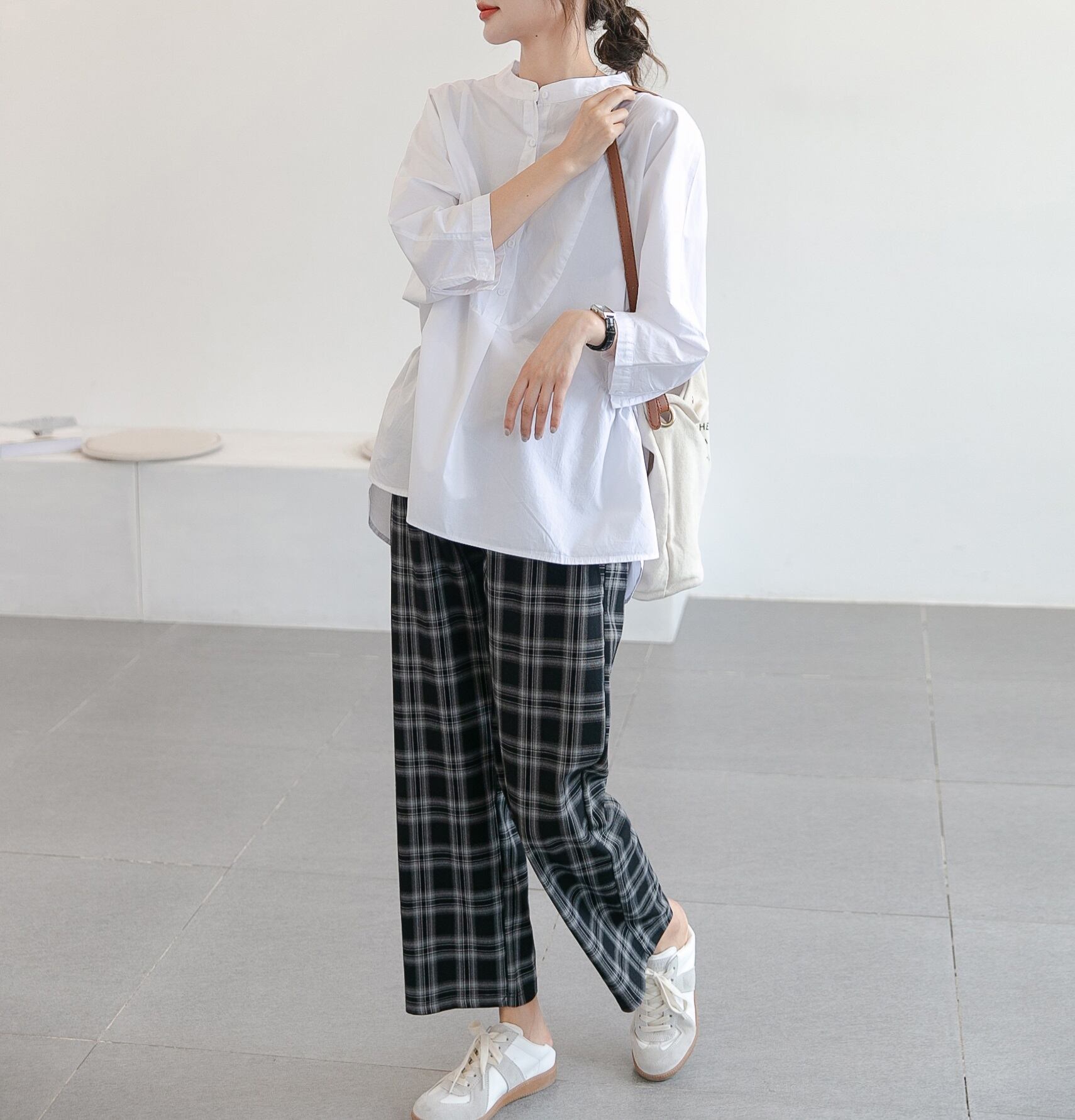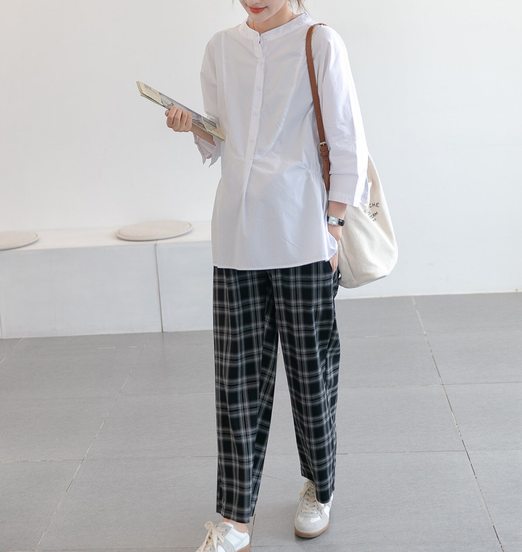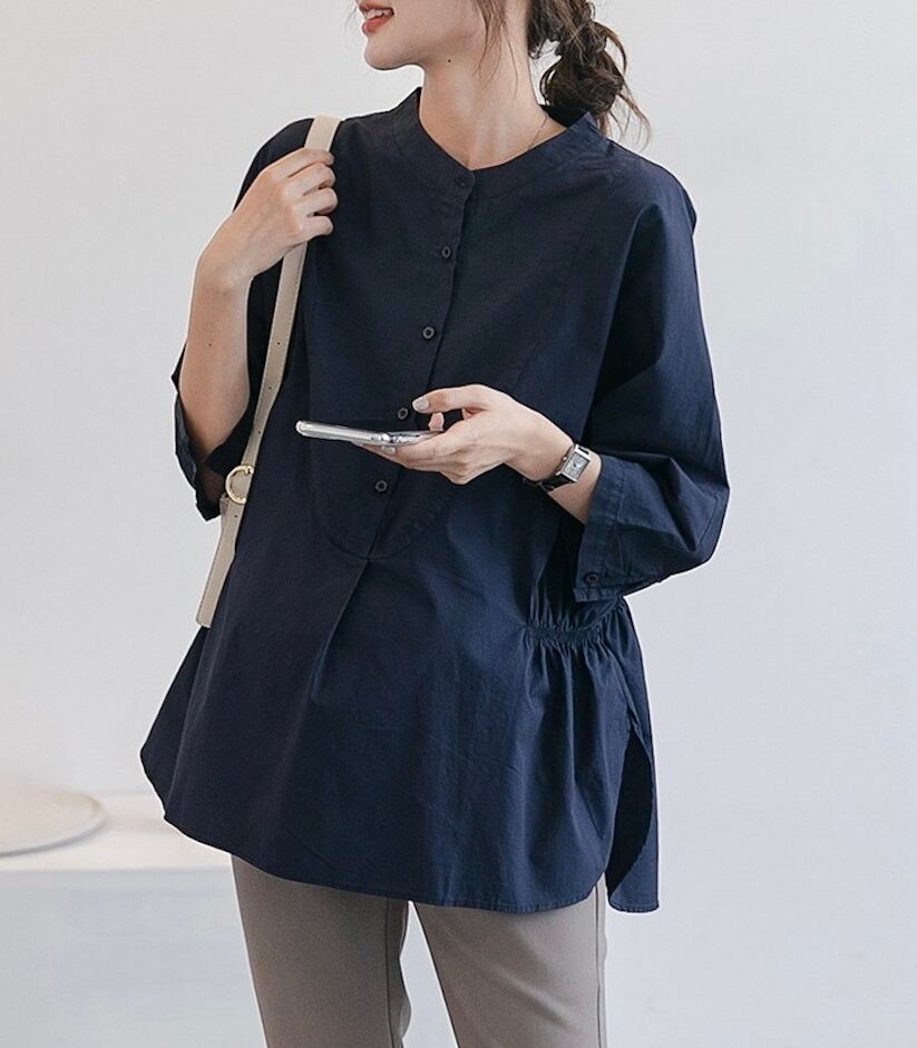 立ち襟 七分袖 ペプラム シャツ ブラウス レディース トップス プルオーバー 丈長 ミディアム 7分袖 スタンドカラー ペプラム Aライン タック スリット サイドスリット ハイウエスト ドロスト ボタン ギャザー 切り替えデザイン かわいい 大人可愛い きれいめ シンプル カジュアル おしゃれ ルーズ 無地 春 夏 秋 ママ マタニティ 通勤 デート お出かけ 旅行 公園 女子会 休日 ショッピング カフェ 楽ちん 体型カバー 普段使い 着回し ゆったり フリーサイズ 白 ホワイト ネイビー