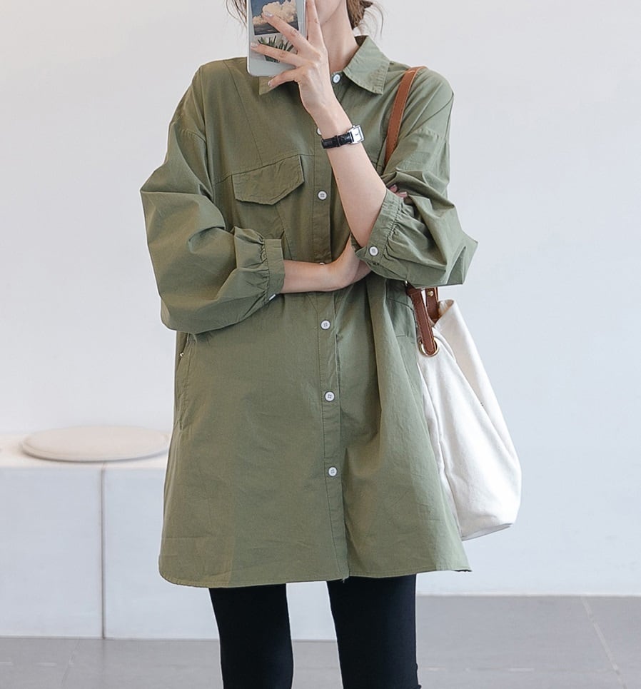 オーバーサイズ 長袖 シャツ レディース トップス 羽織 丈長 ミディアム パフスリーブ ドロップショルダー 襟付き 角襟 ポロカラー ポケット 前開き ドロスト 切り替えデザイン 綿 かわいい 大人可愛い シンプル カジュアル おしゃれ こなれ感 ルーズ 無地 春 秋 ママ マタニティ 通勤 学生 学校 通学 デート お出かけ 旅行 公園 女子会 休日 ショッピング カフェ 重ね着 楽ちん 体型カバー 普段使い 着回し ゆったり フリーサイズ アーミーグリーン