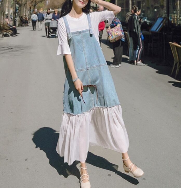 セットアップ シャツ ブラウス デニム ワンピース 2点セット レディース トップス キャミワンピ ミモレ 半袖 フレアスリーブ ラウンドネック フレア 切り替え フェミニン チュール ポケット 透け感 シースルー 異素材ミックス かわいい 大人可愛い カジュアル おしゃれ ガーリー 無地 春 夏 秋 ママ 通勤 学生 学校 通学 デート お出かけ 旅行 公園 女子会 休日 重ね着 体型カバー 普段使い 着回し M L XL 2XL 3XL 4XL 大きいサイズ ゆったり 白 ホワイト デニムブルー