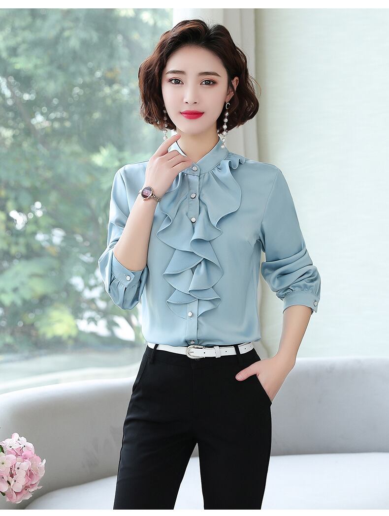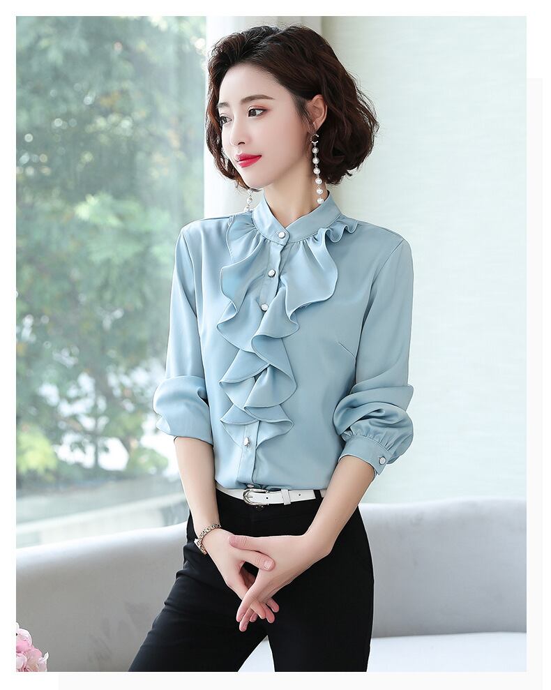 レディース トップス シャツ ブラウス 長袖 立ち襟 スタンドカラー スリム 細身 フェミニン フリル 前開き かわいい 大人可愛い きれいめ シンプル カジュアル 上品 おしゃれ こなれ感 クール エレガント 存在感 フォーマル 無地 春 秋 冬 入学式 入園式 卒業式 卒園式 発表会 授業参観 会議 MTG ミーティング プレゼン オフィス ビジネス OL 通勤 デート お出かけ 普段使い 着回し S M L XL 2XL 3XL 4XL 大きいサイズ 白 ホワイト 黒 ブラック 水色 ブルー レッド