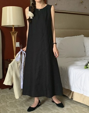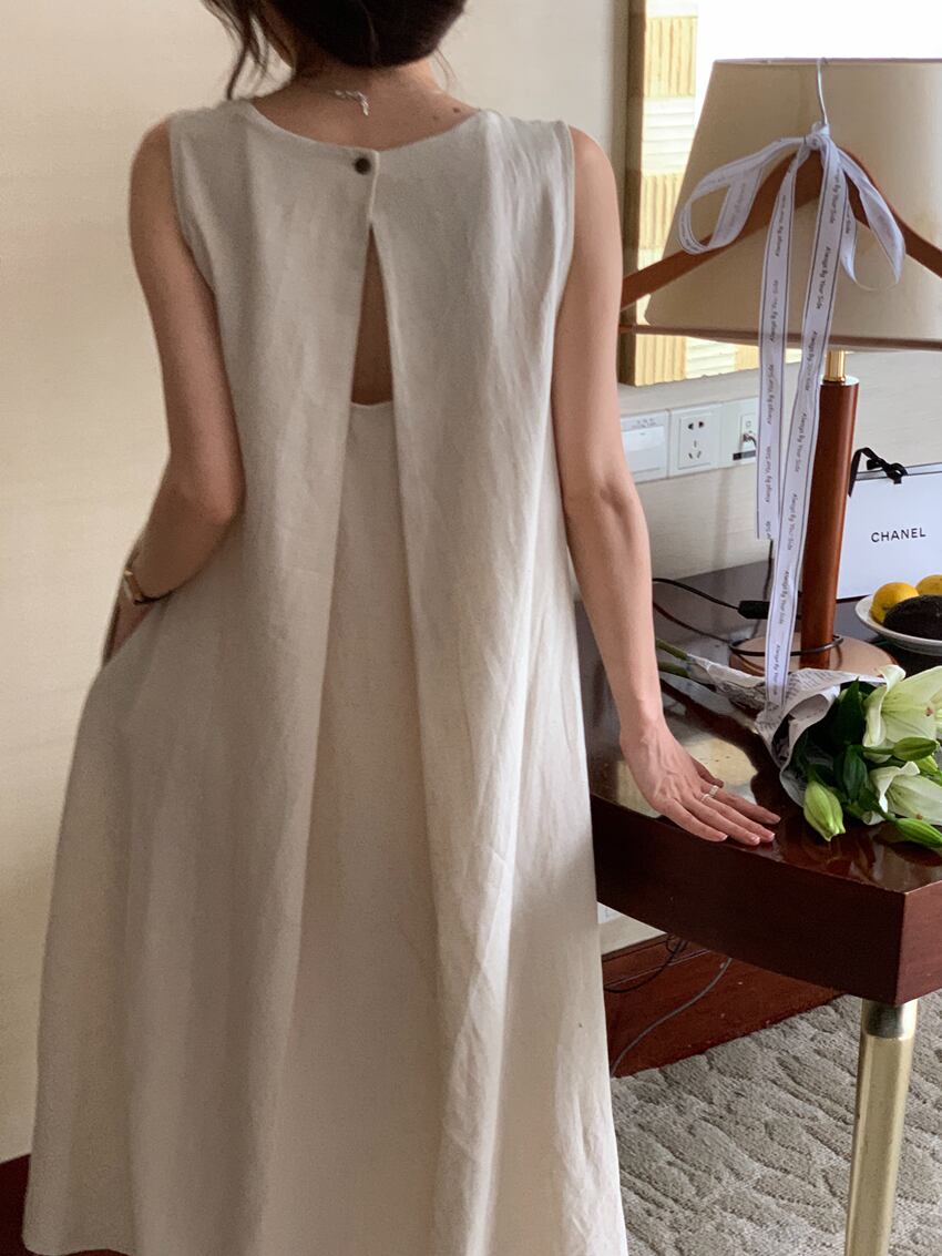 レディース ワンピース サマードレス 膝下 ミモレ ロング 9分丈 袖なし ノースリーブ ラウンドネック 襟なし Aライン バックボタン バックコンシャス バックシャン 背中開き かわいい 大人可愛い きれいめ シンプル カジュアル 上品 おしゃれ こなれ感 抜け感 セクシー ナチュラル 無地 春 夏 ママ 女の子 デート お出かけ リゾート 旅行 海 プール ビーチ バカンス 女子会 ショッピング カフェ 普段使い 着回し リラクシー 定番 楽ちん 体型カバー フリーサイズ 黒 ブラック ベージュ