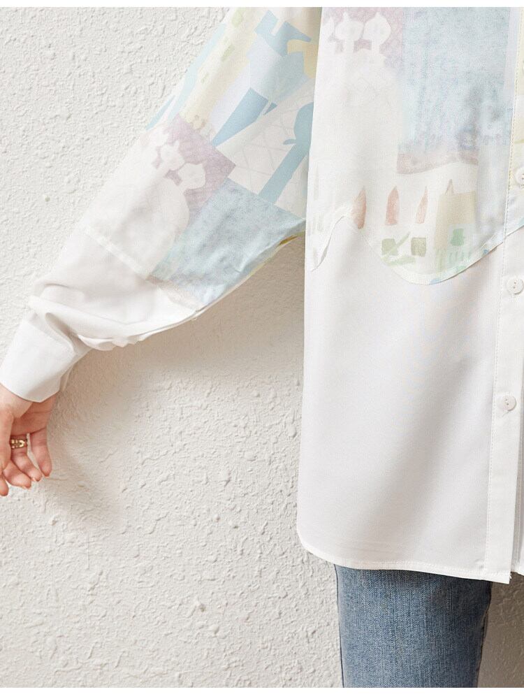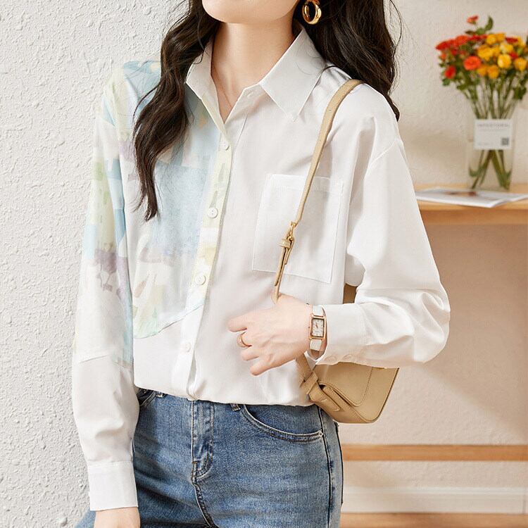 レディース トップス シャツ ブラウス 長袖 襟付き 角襟 ゆったり ボタン ポケット 着痩せ 羽織り アシンメトリー 切り替え フェミニン 前開き かわいい 大人可愛い きれいめ シンプル カジュアル 上品 おしゃれ こなれ感 クール エレガント ナチュラル アート柄 プリント 春 秋 ロングシーズン 発表会 授業参観 ミーティング オフィス ビジネス OL 通勤 学生 学校 通学 デート お出かけ 旅行 女子会 休日 ショッピング 普段使い 着回し 清楚 定番 S M L XL 2XL 白 ホワイト