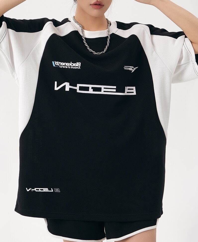 このセットアップは、ロゴ入りTシャツとショートパンツがセットになっており、上下の組み合わせでコーディネートの手間を省くことができます。カジュアルなデザインながらも、バイカラーの配色やショートパンツのサイドスリットなどのディテールがおしゃれ感を演出しています。