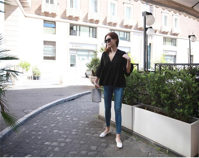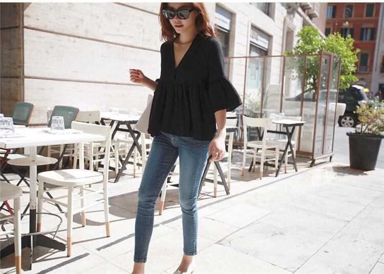 フェミニンスタイルを演出するペムラムブラウス。Vネックとフレアスリーブが女性らしい印象を与え、ふんわりフレアのペプラムデザインがさりげない体型カバーにも効果的。
