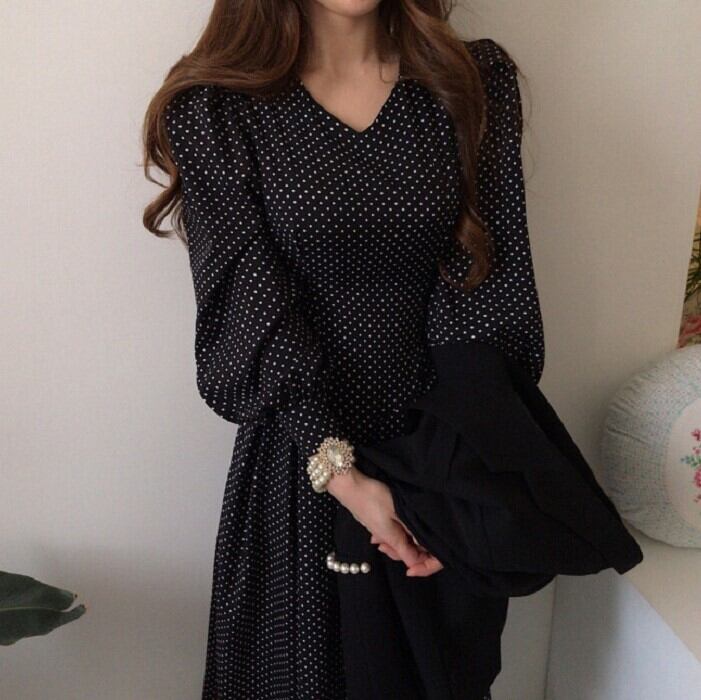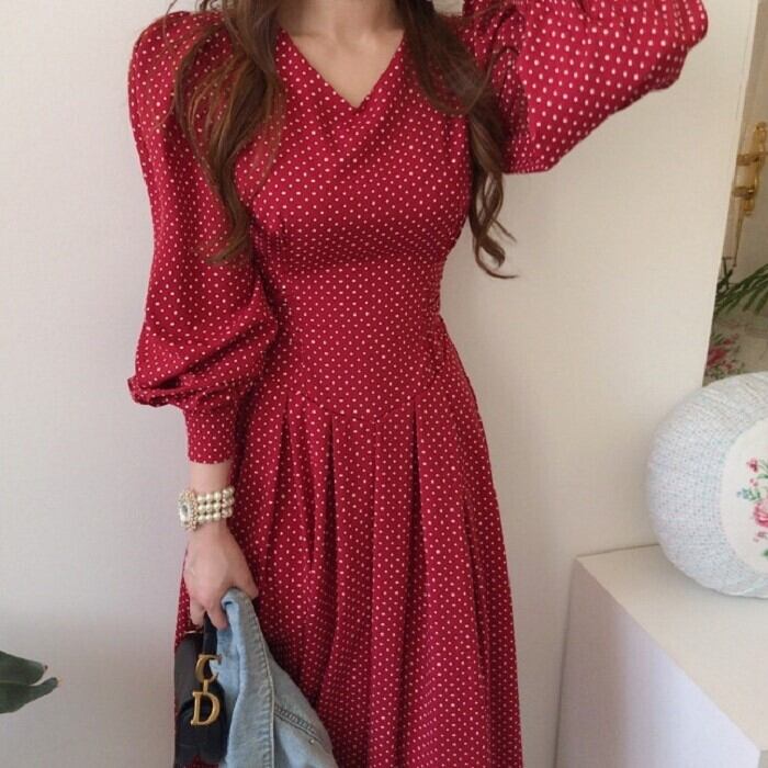 レディース ワンピース 膝下 ミモレ ロング 長袖 ボリューム袖 ランタンスリーブ Vネック 襟なし フレア Aライン フェミニン タック ウエストマーク バックリボン バックコンシャス ハイウエスト かわいい 大人可愛い きれいめ シンプル カジュアル 上品 おしゃれ こなれ感 キュート ドット柄 水玉 総柄 春 秋 ママ 女の子 OL 通勤 学生 学校 通学 デート お出かけ リゾート 旅行 レストラン 女子会 休日 体型カバー 脚長 普段使い モテ 清楚 S M L 黒 ブラック 赤 レッド