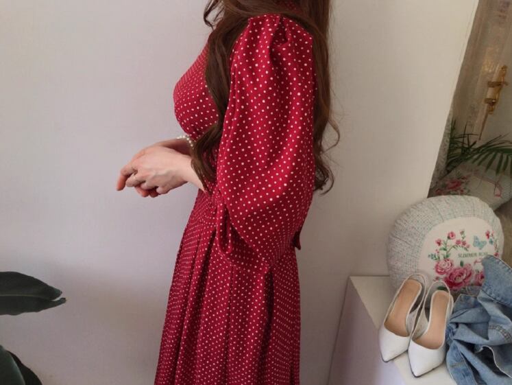 女性らしいスタイルを演出する、ランタンスリーブのドット柄ワンピースが登場しました。後ろでリボンを結ぶウエストマークデザインが女性らしいシルエットを際立たせます。体型カバーしながら脚長効果もあるハイウエストのタックフレアシルエットも魅力。膝下のミモレ~ロング丈デザインで上品で清楚な雰囲気に。きれいなカラーでフェミニンに決まるレッドとフレンチシックな印象のブラックの2色からお選びいただけます。