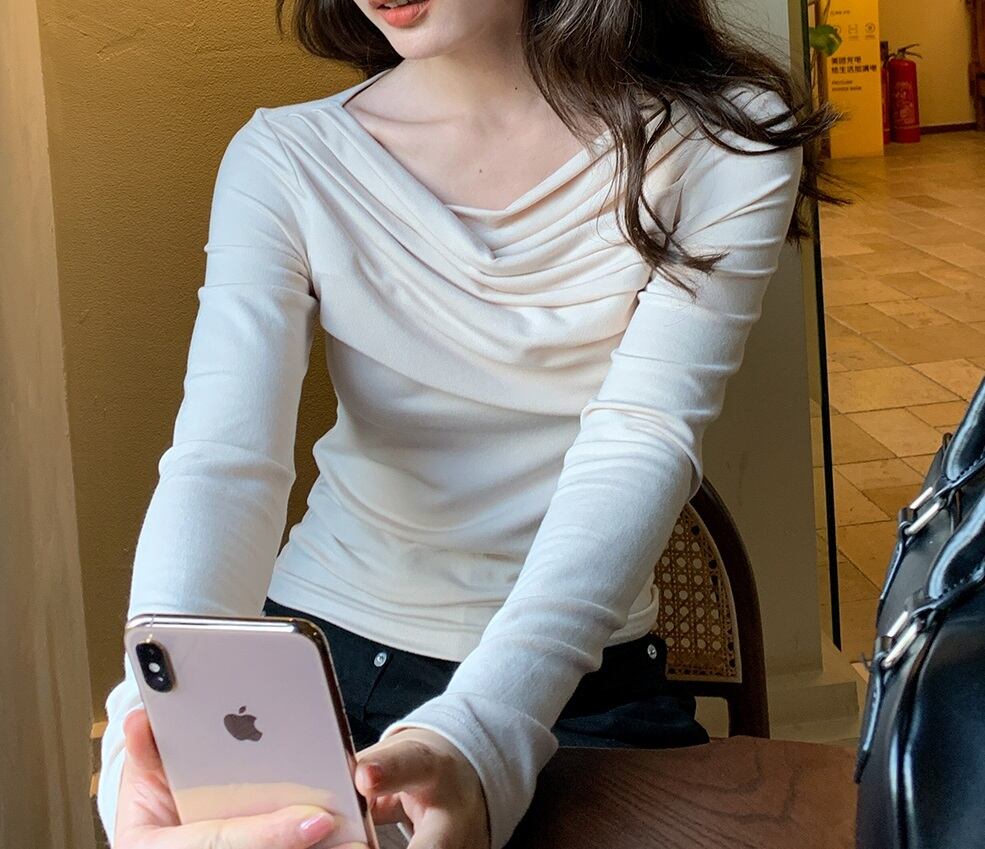 フロントのカシュクール風のデザインがおしゃれな、長袖ロンTが登場しました。襟なしのボートネックで、シンプルながらもエレガントな印象を与えます。伸縮性があり、着心地も抜群。デイリーコーディネートに取り入れやすい無地のカラーバリエーションも魅力です。
