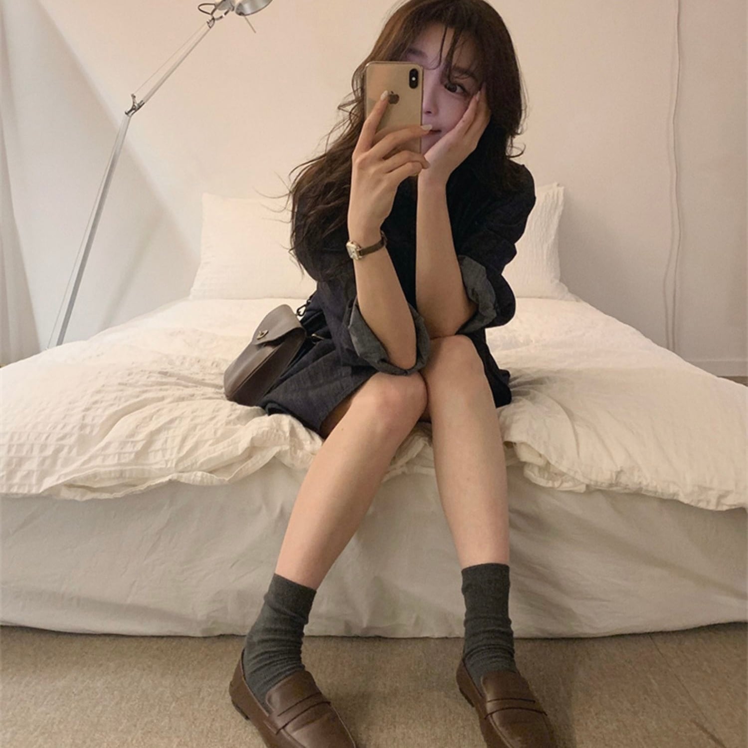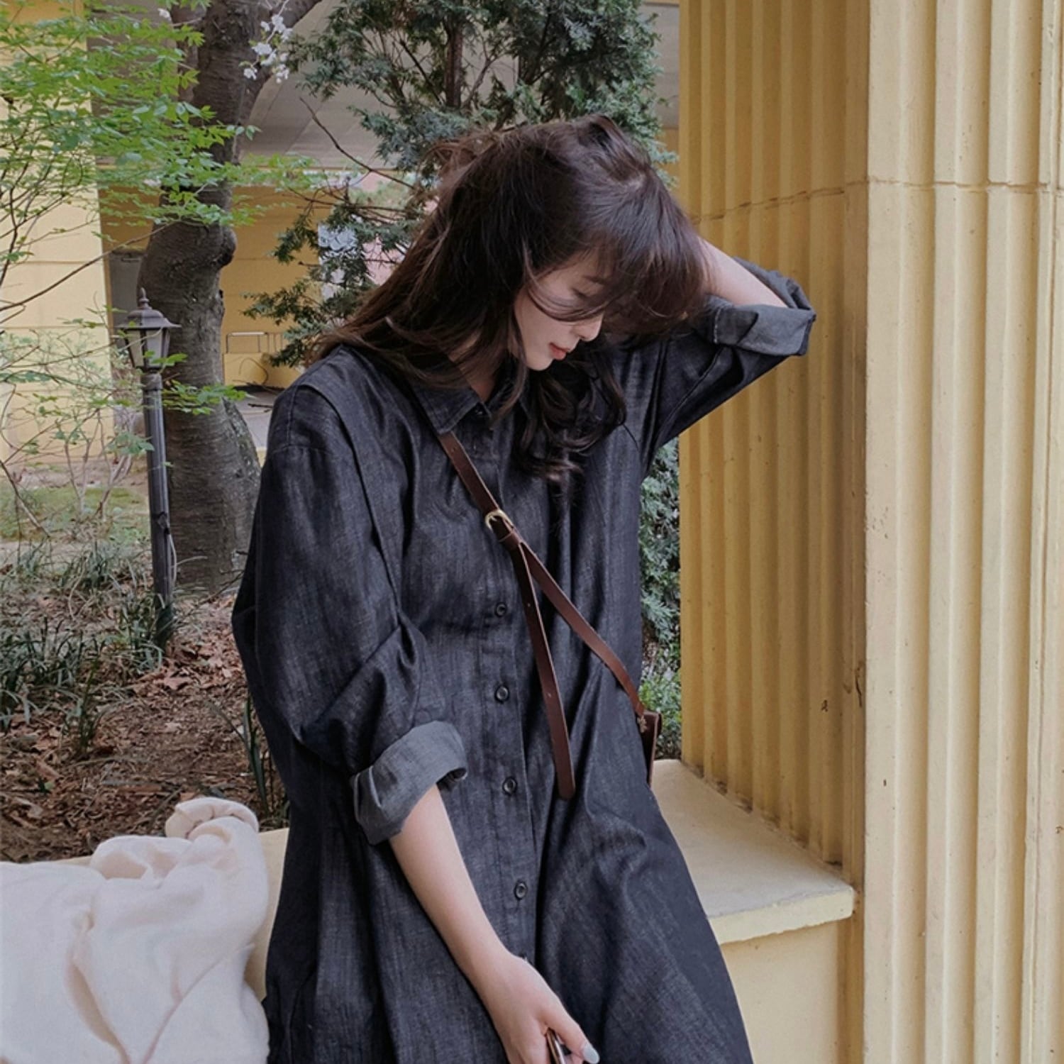 シンプルでありながら、トレンド感溢れるデザインの韓国風デニムシャツワンピース。