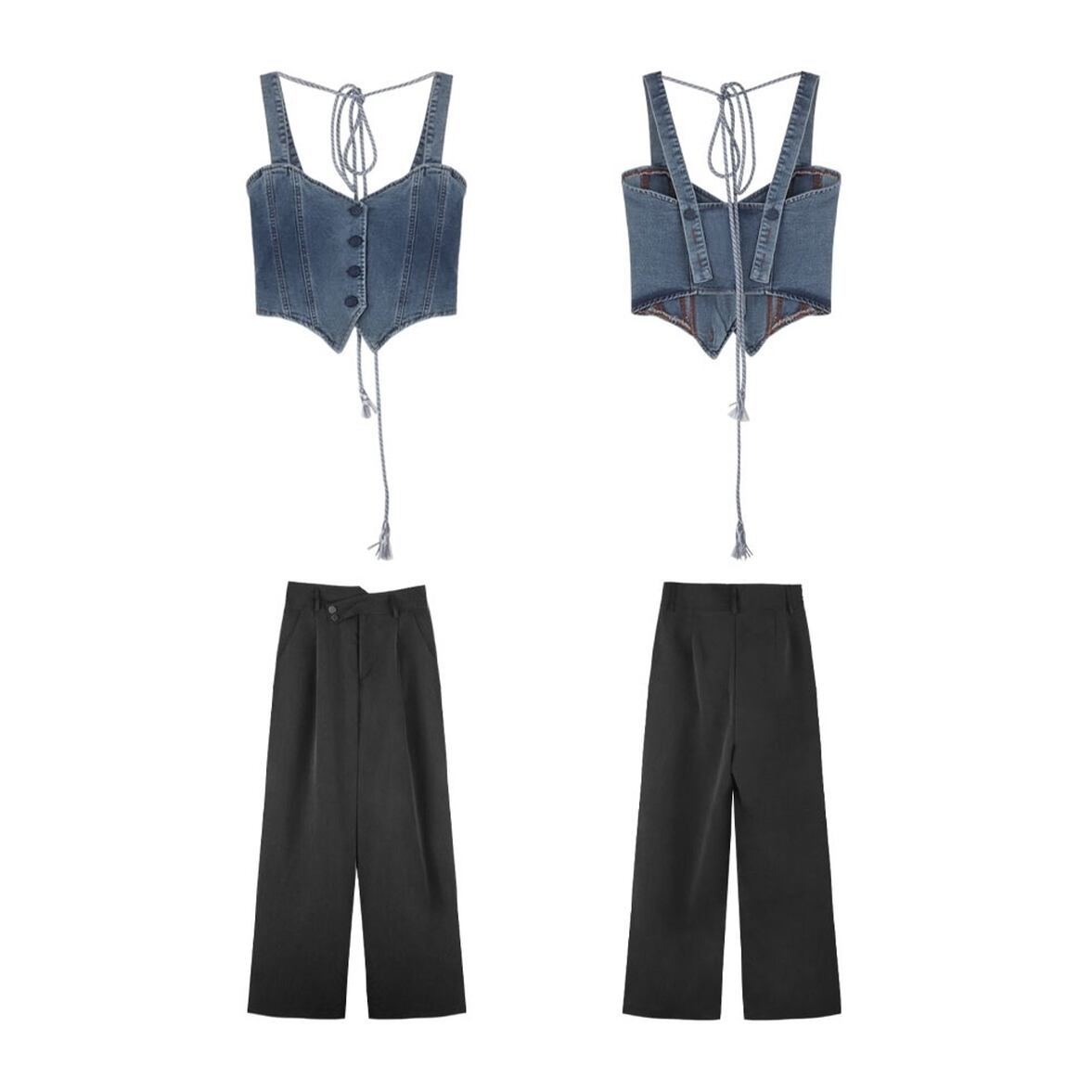 デニムトップ+ロングパンツセットアップ レディース セットアップ ロングパンツ ワークパンツ チノパンツ タックパンツ スラックス タンクトップ キャミソール ミニ クロップド丈 ノースリーブ スリム 細身 ストレート セパレート フェミニン ストリート デニム かわいい 大人可愛い きれいめ カジュアル おしゃれ かっこいい こなれ感 ラフ マニッシュ ガーリー クール キュート アクティブ 夏 デート お出かけ アウトドア キャンプ パーティー イベント 休日 ショッピング ゆったり