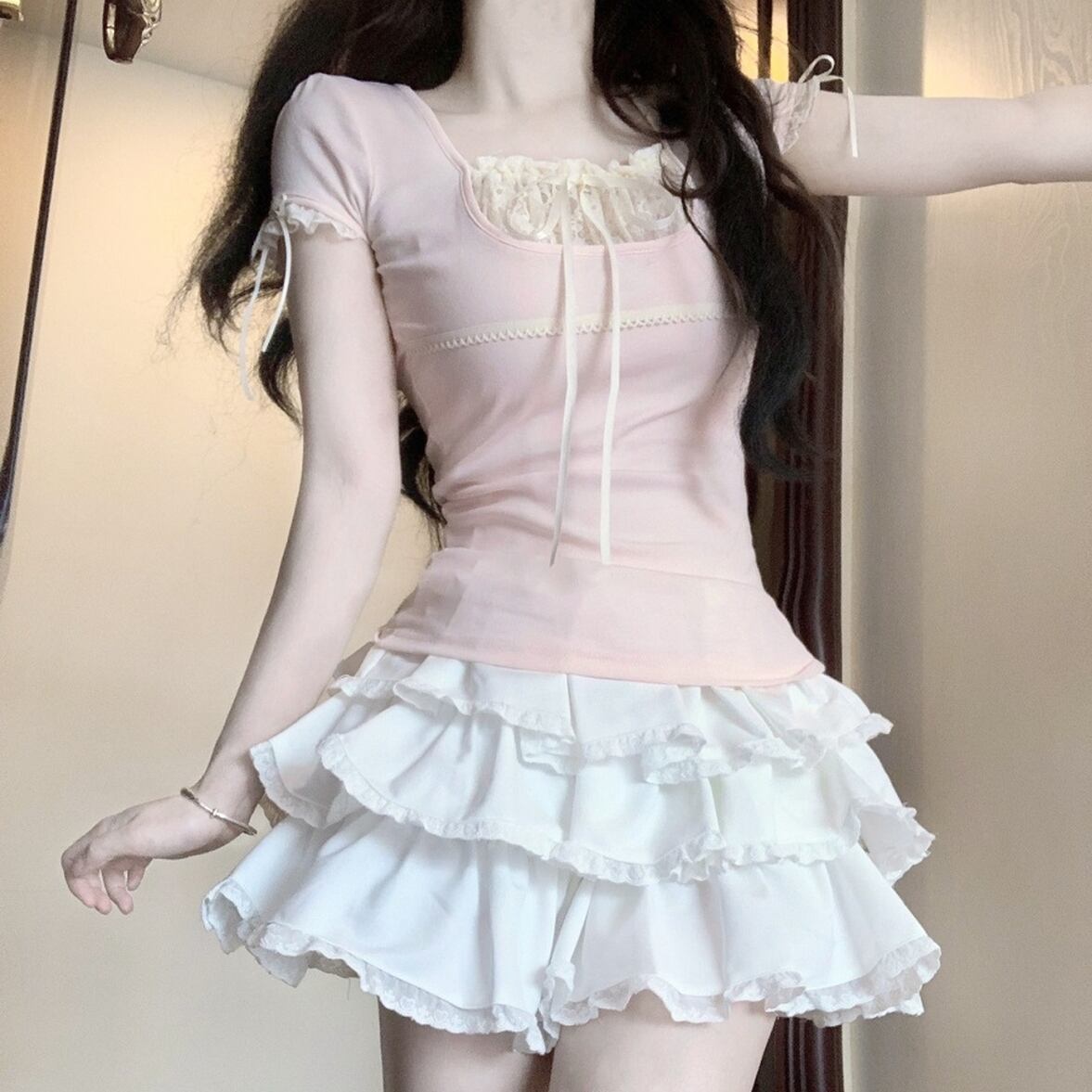 リボンレース付き半袖シャツ フリルレースリボンTシャツ レディース トップス シャツ ブラウス カットソー 半袖 ラグラン ラウンドネック スリム 細身 フェミニン レース リボン 薄手 シアー かわいい 大人可愛い きれいめ カジュアル 上品 おしゃれ レトロ こなれ感 ガーリー エレガント ラブリー キュート 春 夏 オフィス 通勤 通学 デート お出かけ イベント 女子会 休日 ショッピング 普段使い モテ トレンド インスタ映え ゆったり レース切り替えTシャツ