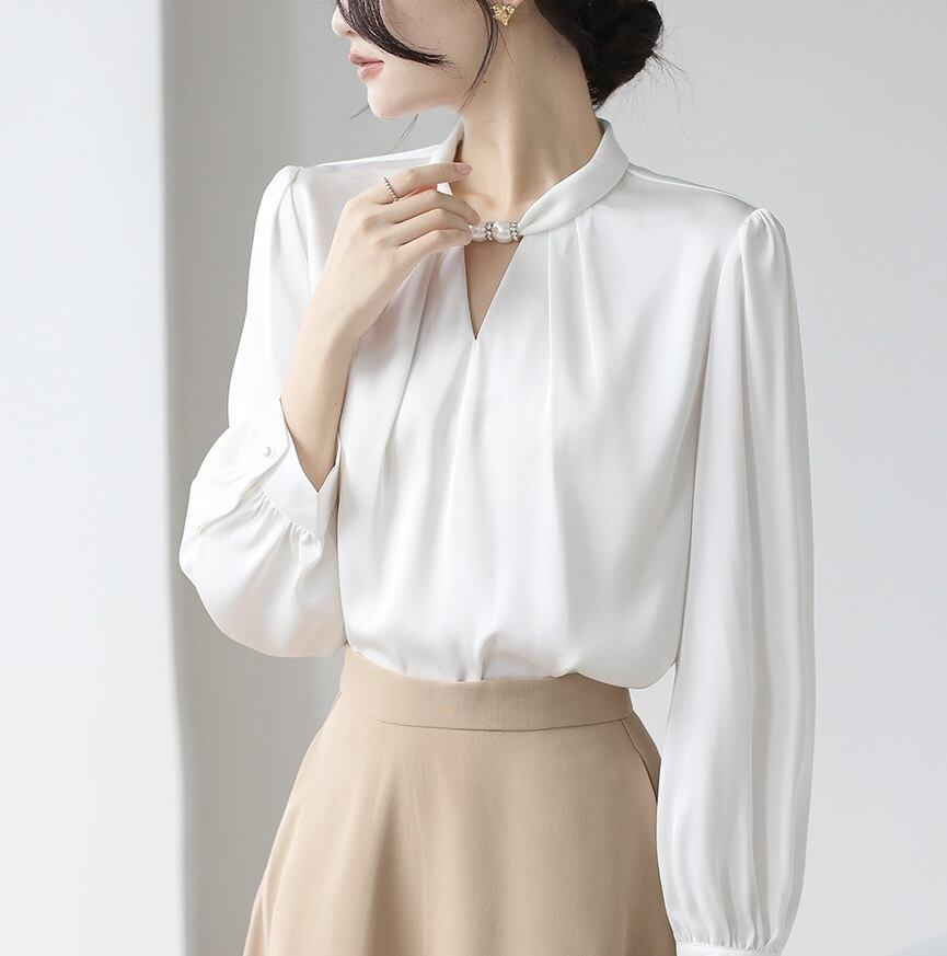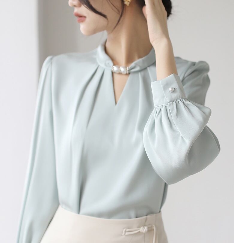 パール付き 立ち襟 Vネック シャツ ブラウス レディース トップス プルオーバー 丈長 ミディアム 長袖 パフスリーブ Vネック 襟付き スタンドカラー ドレープ タック ボタン パールボタン かわいい 大人可愛い きれいめ シンプル 上品 おしゃれ エレガント フォーマル とろみ感 無地 春 秋 入学式 入園式 卒業式 卒園式 発表会 授業参観 ママ オフィス OL 通勤 デート お出かけ イベント 旅行 女子会 休日 カフェ 普段使い 着回し S M L 白 ホワイト アクアブルー