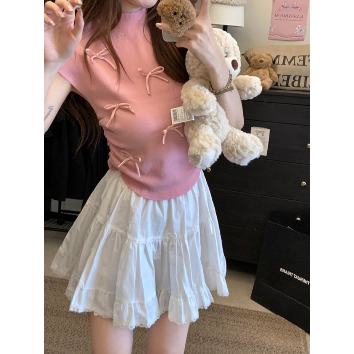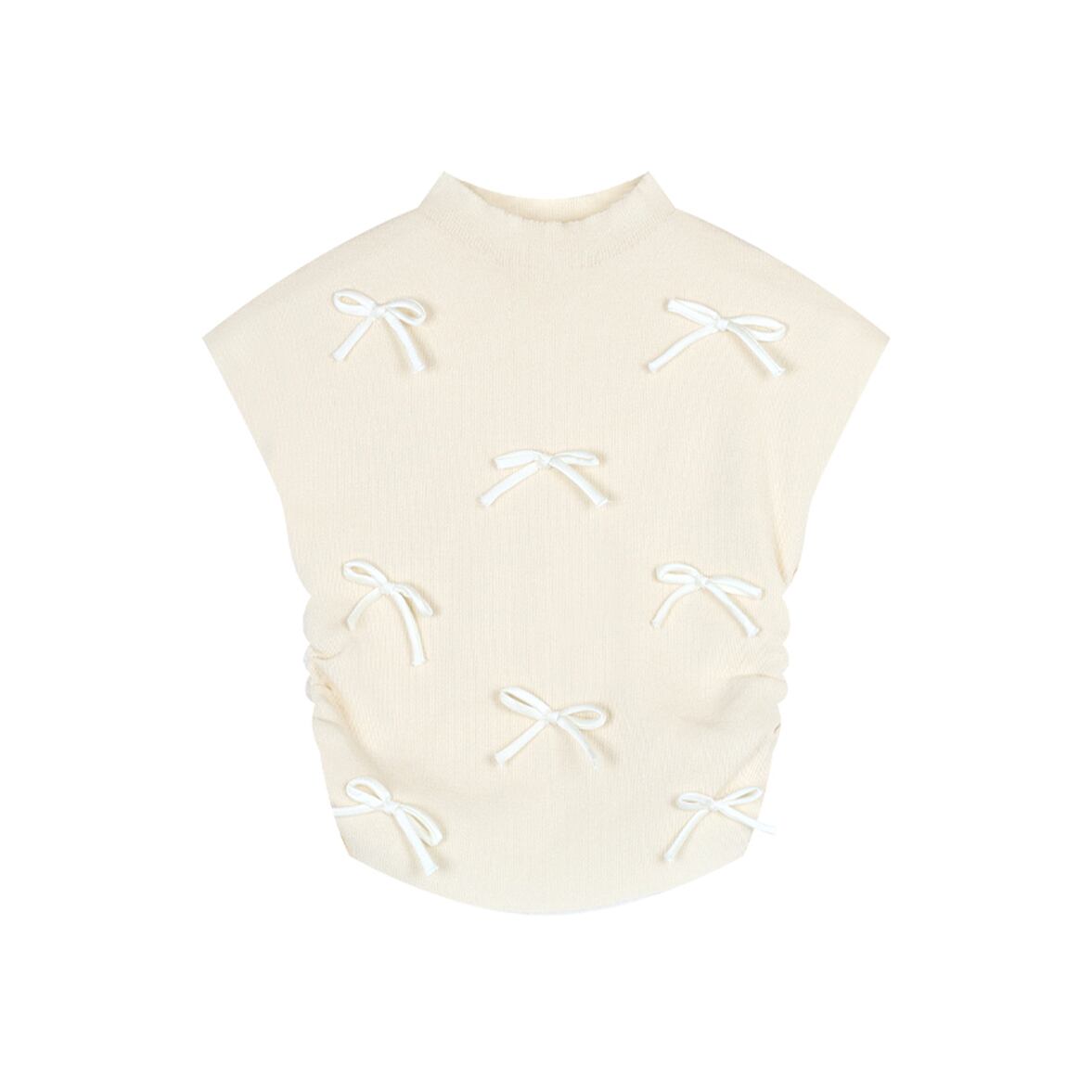 リボンのデザインが可愛らしいガーリーなカットソー。フレンチスリーブで二の腕をさりげなくカバーします。ワントーンでどんなシーンでも上品に着映えするアイテムです