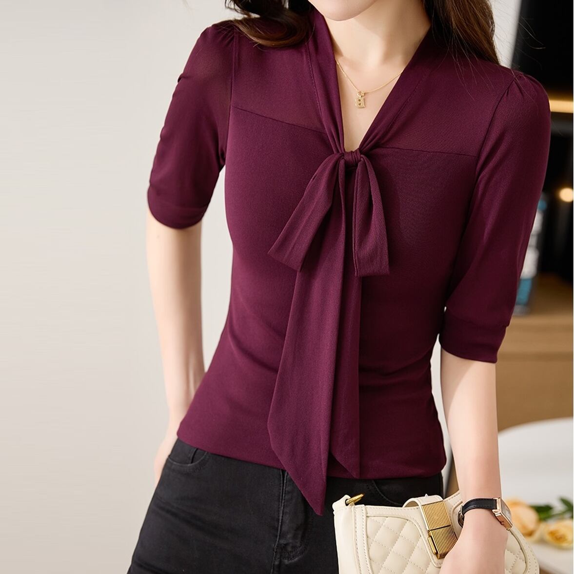 ボウタイシャツ 5分袖ボウタイブラウス レディース トップス シャツ ブラウス カットソー 半袖 5分袖 Vネック 襟なし ノーカラー ボウタイ りぼんタイ タイト スリム 細身 シフォン かわいい 大人可愛い きれいめ シンプル 上品 おしゃれ ガーリー エレガント 無地 春 夏 オフィス 通勤 通学 デート お出かけ 女子会 休日 ショッピング 普段使い 着回し ボルドー ブラウン ブラック フェミニン ボウタイブラウス Vネックボウタイシャツ 5分袖ボウタイシャツ Vネックタイブラウス