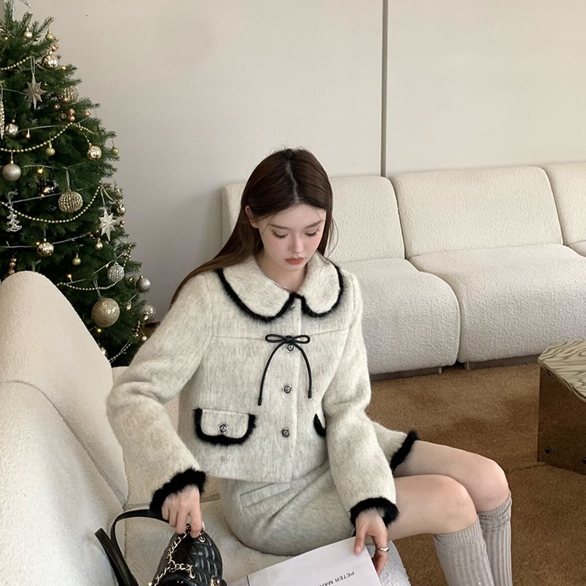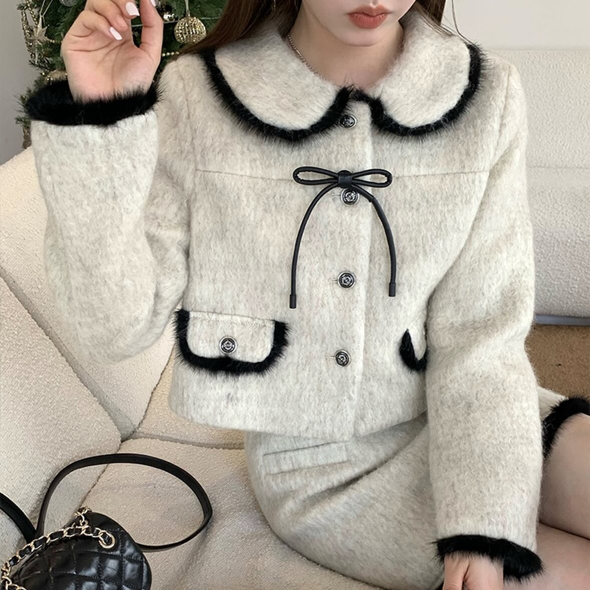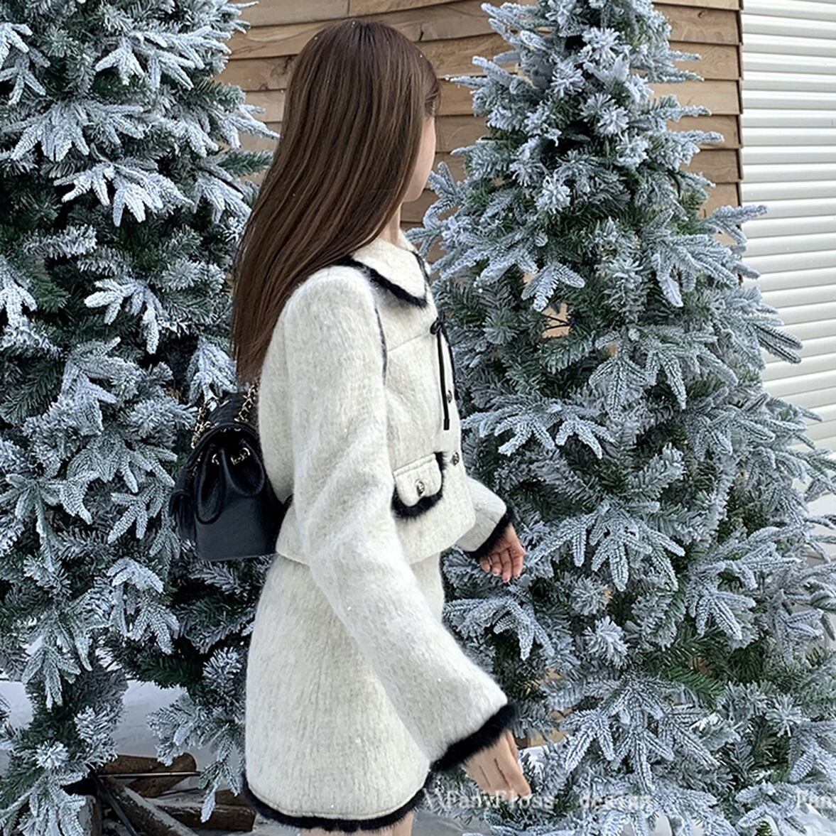 配色ニットスーツセットアップ ミニスーツセットアップ レディース セットアップ スカート ジャケット 上着 ミニスカート ミニ ショート 長袖 襟付き 丸襟 リボン 前開き バイカラー 配色 かわいい 大人可愛い きれいめ シンプル 上品 おしゃれ レトロ ガーリー エレガント クラシカル 秋 冬 オフィス 通勤 通学 デート お出かけ イベント 女子会 休日 ショッピング 体型カバー モテ トレンド クルーネック セパレート フェミニン 上下セット レトロスーツ