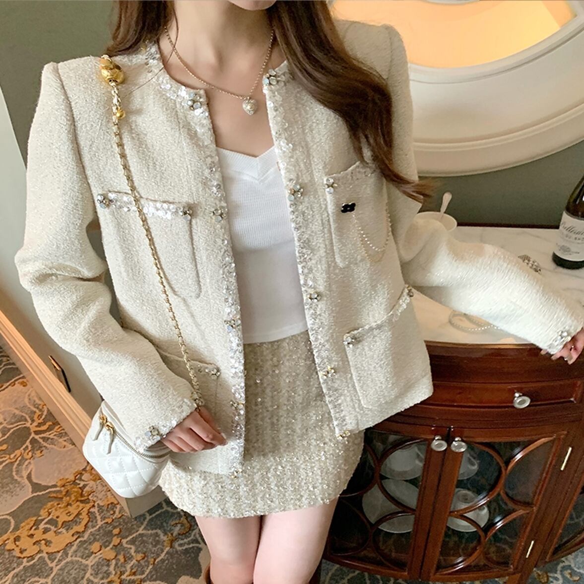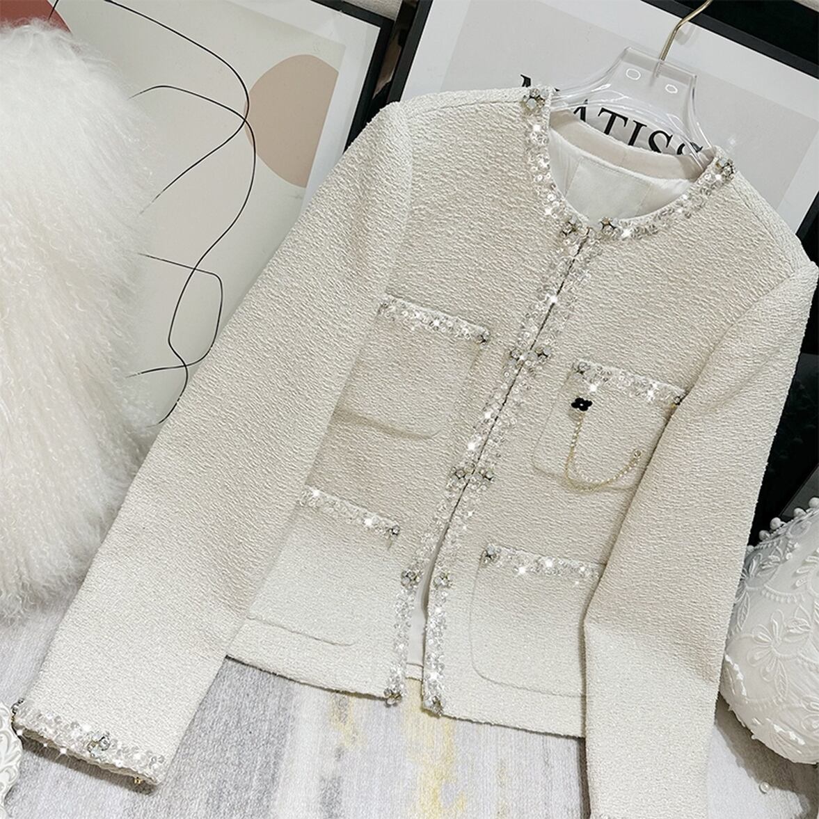ビジュー付きツイードジャケット ノーカラービジュージャケット レディース ジャケット 上着 アウター ノーカラージャケット ツイードジャケット 長袖 ラメ感 クルーネック 襟なし ノーカラー スリム 前開き スパンコール ツイード ビジュー かわいい 大人可愛い きれいめ カジュアル 上品 おしゃれ レトロ ガーリー エレガント フォーマル クラシカル ロングシーズン オフィス 通勤 通学 デート お出かけ 女子会 ショッピング 休日 重ね着 着回し ゆったり フェミニン