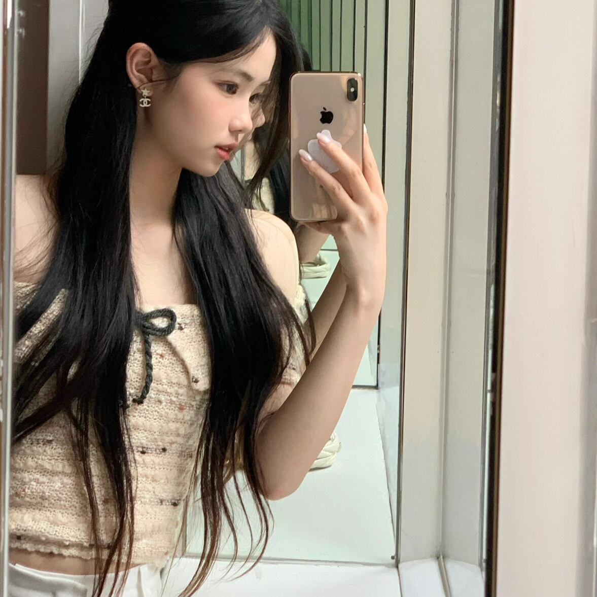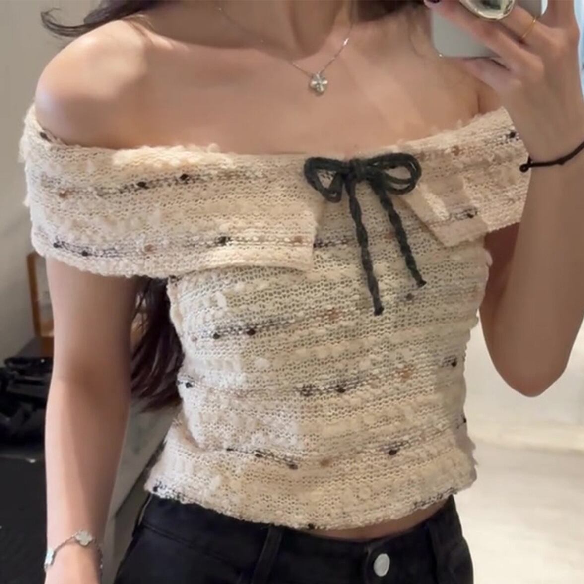 コンパクトなシルエットが可愛いオフショルダーニットトップス。フロントのリボンがアクセントです。短い丈でちらりと肌見せしてヘルシーさをアピール。アクセサリーをプラスして華やかに着こなしても決まります