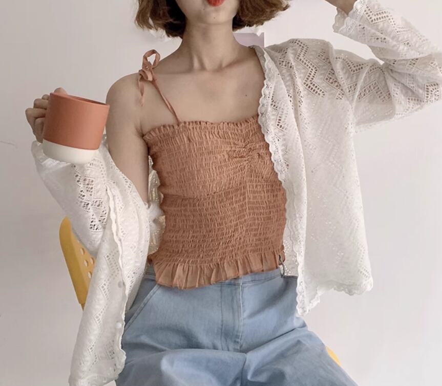 ルームウェアやパジャマとしてもおしゃれに着こなせる、夏にピッタリな8分丈のトップスが登場しました。編み目が可愛いデザインで、フェミニンな雰囲気を演出してくれます。Vネックにフリルやレースアップが施され、女性らしさを引き立てます。透け感のある素材はシースルー効果で優雅な印象を与え、サテンのような滑らかな肌触りも魅力的です。