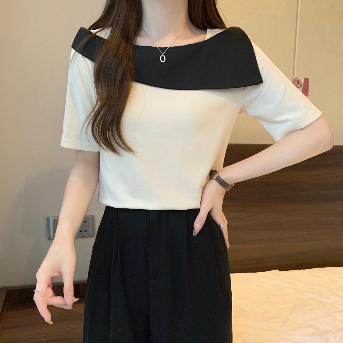 オフショルダー襟付き半袖シャツ アシメ襟付きオフショルシャツ レディース トップス シャツ ブラウス カットソー Tシャツ 半袖 5分袖 ボートネック 襟付き スリム 細身 アシンメトリー オフショルダー バイカラー 配色 かわいい 大人可愛い きれいめ シンプル カジュアル 上品 おしゃれ こなれ感 ガーリー エレガント キュート 無地 春 夏 オフィス 通勤 通学 デート お出かけ 女子会 休日 ショッピング ブラック オフホワイト ビッグカラーシャツ フェミニン