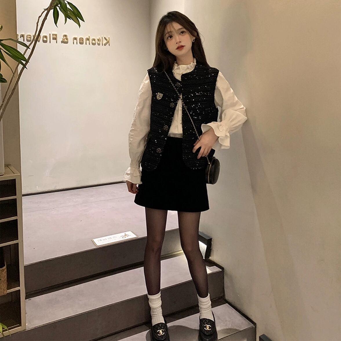 キラキラのベストとビッグフリルデザインのシャツブラウスのセットアイテム。それぞれ単品でも使えて可愛く決まる優秀アイテムです。着るだけでおしゃれなコーデが完成して着映えする便利なツーピースです