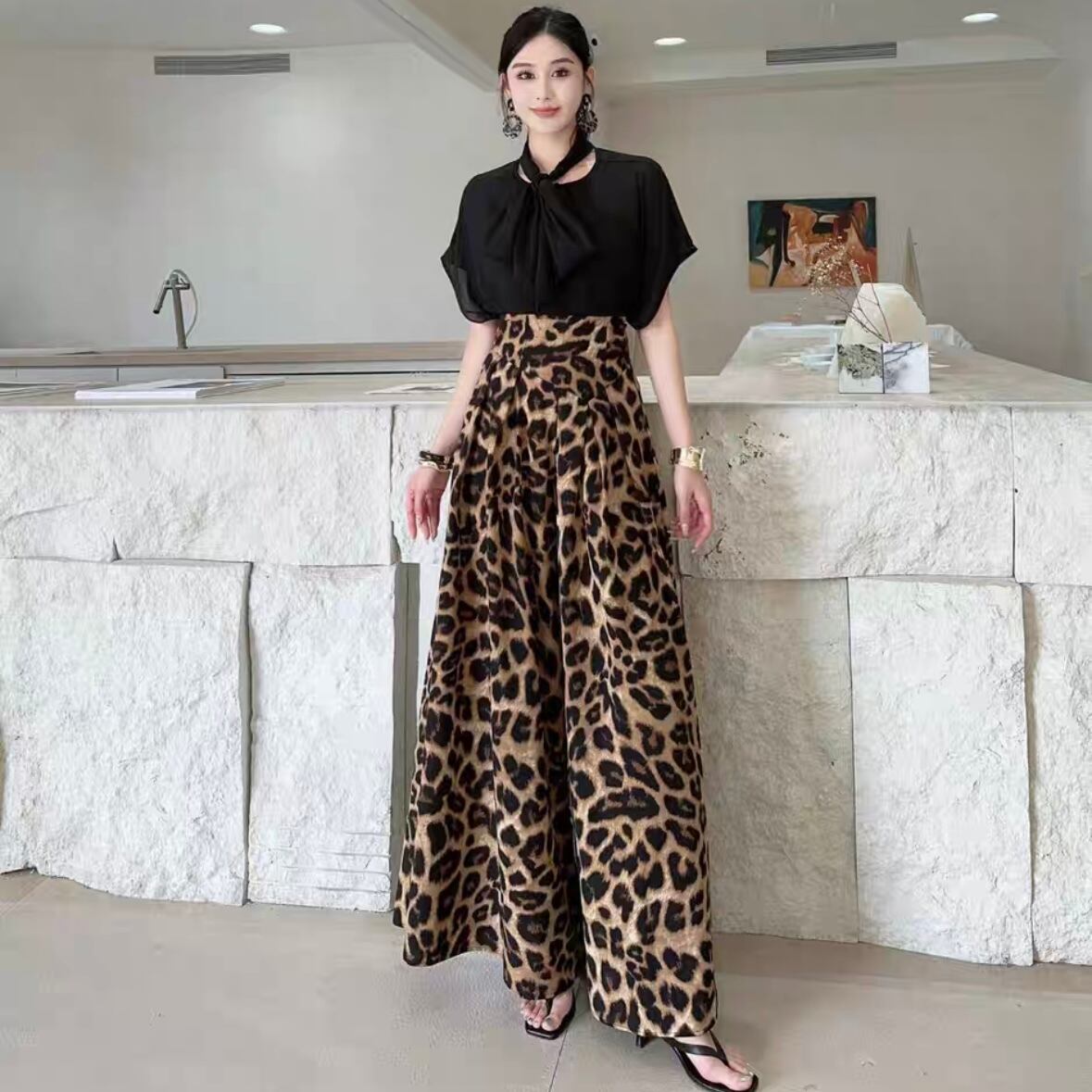 上品でありながらも、ちょっとした大人可愛さを演出する豹柄ロングパンツ。