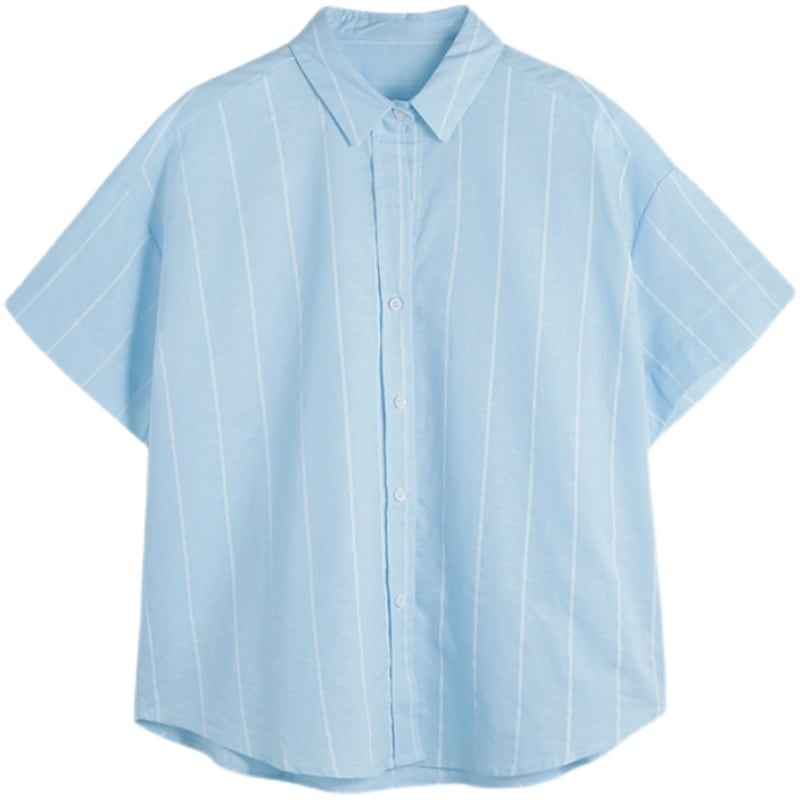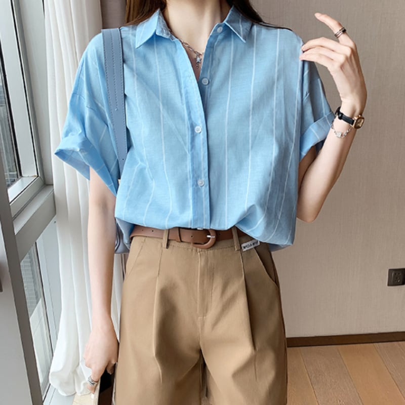清涼感漂うストライプ柄のルーズ半袖シャツ。ミディアム丈で女性らしいシルエットを演出し、ドロップショルダーやポロカラーが大人可愛い雰囲気を醸し出します。カジュアルからきれいめまで幅広く活躍し、春夏秋のコーディネートにピッタリ。ルーズな着心地で体型もカバーし、デートやお出かけ、休日のシーンにもおすすめです。