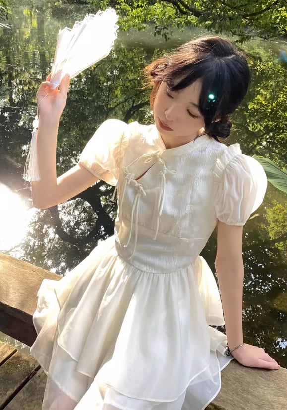ドレス ワンピース パーティー 結婚式 二次会 ダンス 衣装 コスプレ コスチューム 演劇 膝下 半袖 ドルマンスリーブ パフスリーブ フレアスリーブ 襟付き セミフレア チャイナドレス チュール シフォン フリル リボン 透け感 シースルー 可愛い 大人可愛い エスニック エキゾチック キュート ガーリー 主役級 とろみ感 抜け感 華やか パーティー イベント リゾート 旅行 ホテル ガーデン レストラン 高原 韓国 春 夏 白