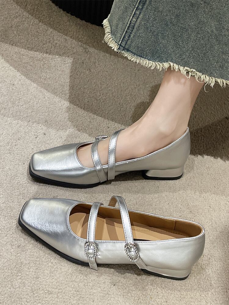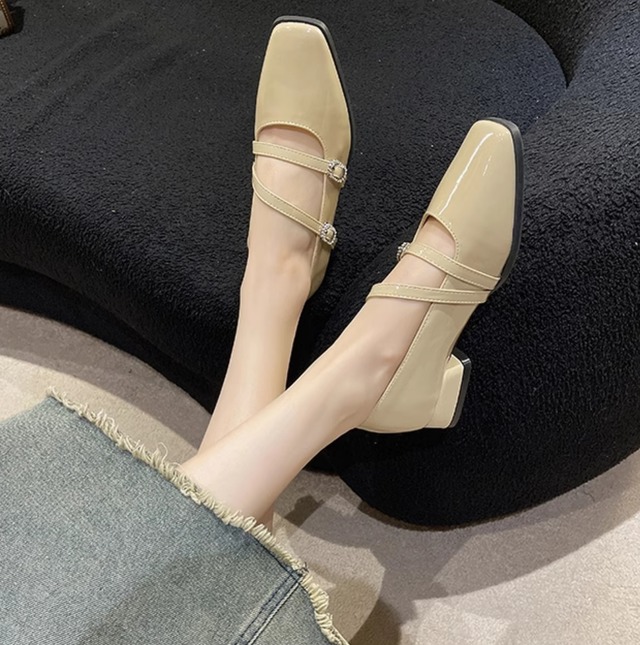 エレガントで華やかな艶ありPUレザーパンプス。スクエアトゥのダブルストラップ仕様。足元からオシャレ感を演出し、美脚効果も抜群です。3cmの太ヒールで歩きやすく、長時間履いても疲れにくいのも嬉しいポイント。ラインストーンバックルがアクセントになり、上品な印象を与えます。