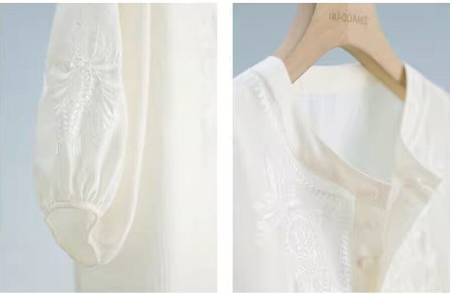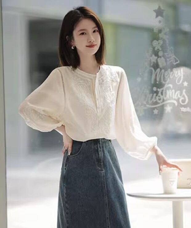 パフスリーブやヘンリーネックなど、女性らしいディテールが詰まった一枚。花柄刺繍や透け感のあるシアー素材が、上品な印象を与えます。