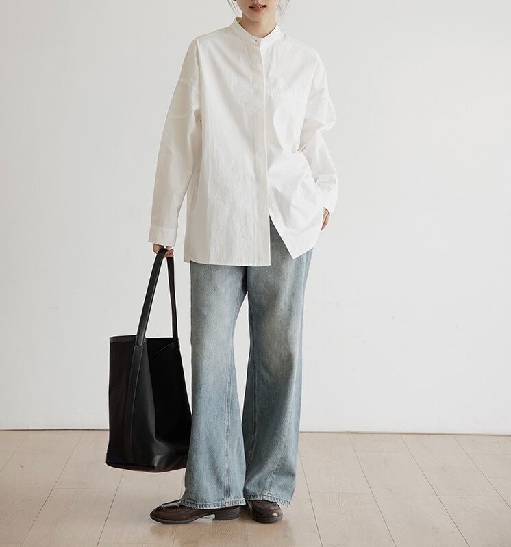 立ち襟 長袖 シャツ レディース トップス 丈長 ミディアム 長袖 ドロップショルダー 襟付き スタンドカラー 前開き ボタン かわいい 大人可愛い きれいめ シンプル カジュアル 上品 おしゃれ こなれ感 マニッシュ ルーズ フォーマル ベーシック 無地 春 秋 冬 ママ 通勤 学生 学校 通学 デート お出かけ 旅行 公園 女子会 休日 ショッピング カフェ 重ね着 体型カバー 普段使い 着回し 定番 S M L 白 ホワイト