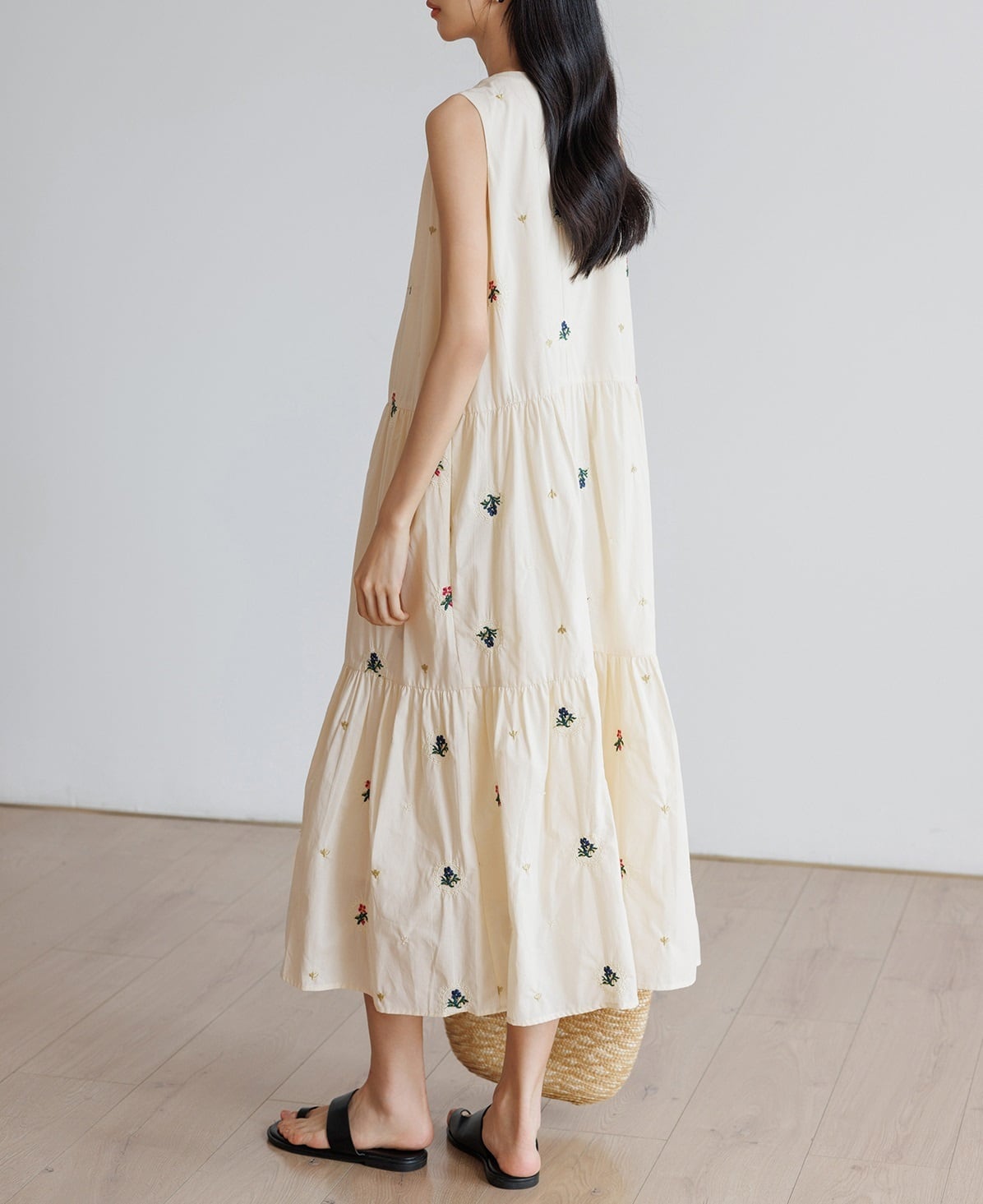 繊細な小花柄の刺繡が施されたノースリーブティアードワンピースをご紹介致します。大人可愛いデザインのAラインシルエットは、誰もが着るだけで思わず微笑んでしまうこと間違いなしです。膝下のミモレ丈は、女性らしいスタイルを演出し、さらにレトロな雰囲気も演出します。