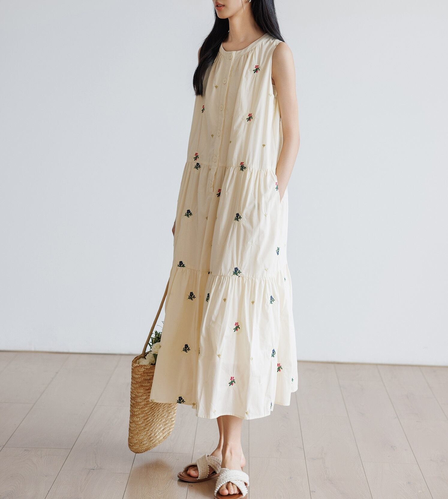 小花柄 刺繡 ノースリーブ ティアードワンピース レディース ワンピース 膝下 ミモレ 袖なし ラウンドネック 襟なし Aライン 切り替え ドレープ ティアード 刺繍 ボタン 切り替えデザイン かわいい 大人可愛い カジュアル おしゃれ レトロ こなれ感 ルーズ 花柄 フラワー 春 夏 秋 ママ 通勤 学生 学校 通学 デート お出かけ 旅行 公園 女子会 休日 ショッピング カフェ 重ね着 楽ちん 体型カバー 普段使い 着回し S M L アプリコット