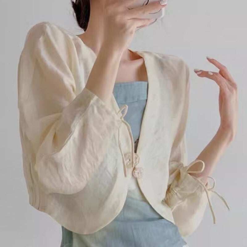 アジアンテイスト漂うショート丈のシアーカーディガン。