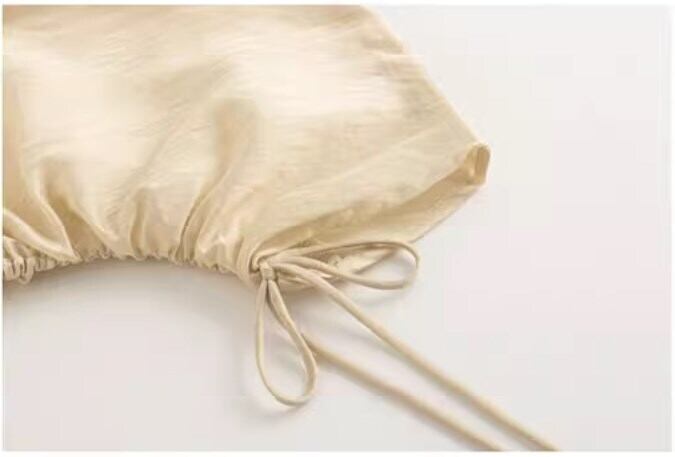 袖部分のドロストでシルエットの変化も楽しめ、Vネックに透け感のあるシアー生地が上品な印象を与えます。