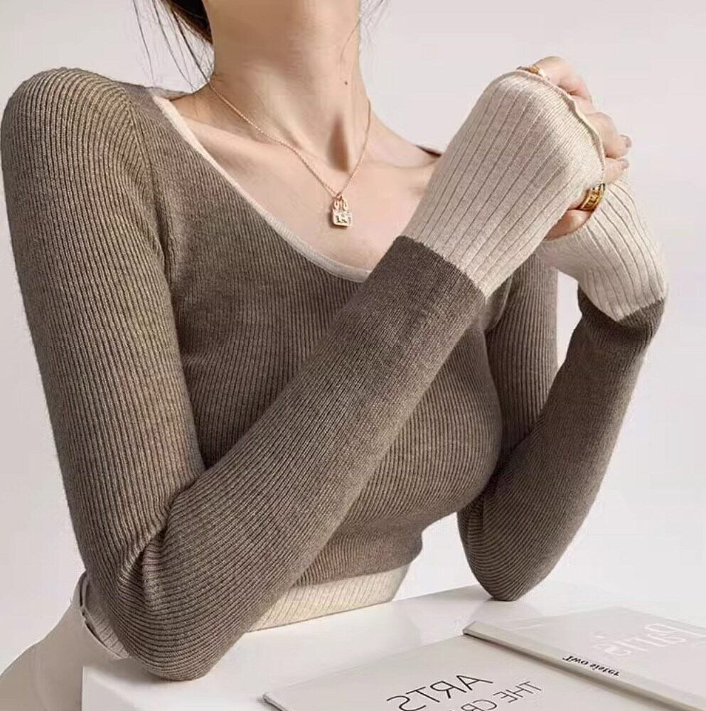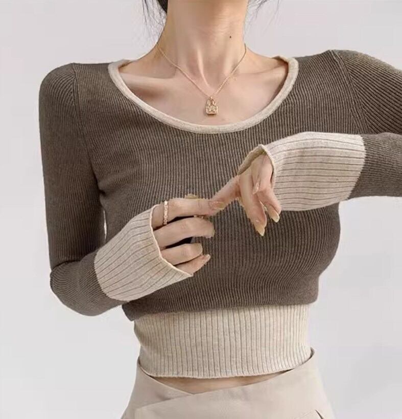 レディース トップス ニット セーター プルオーバー ショート 長袖 Uネック タイト スリム 細身 切り替え フェミニン へそ出し リブ リブニット 切り替えデザイン バイカラー 配色 コントラスカラー かわいい 大人可愛い きれいめ シンプル カジュアル 上品 おしゃれ こなれ感 抜け感 ベーシック 無地 春 秋 学生 学校 通学 デート お出かけ お泊まり 公園 女子会 休日 高原 ガーデン ショッピング カフェ 普段使い 着回し モテ 定番 S M 茶色 ブラウン アースカラー