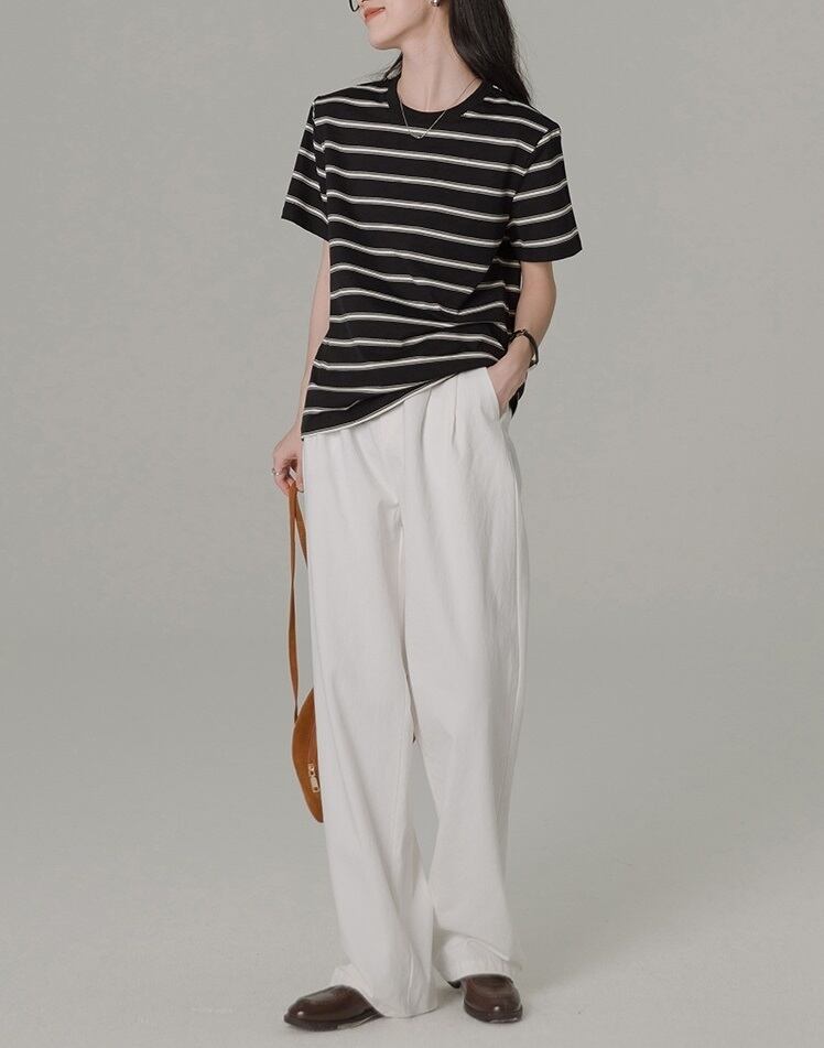 ボーダー柄 半袖 Tシャツ レディース トップス カットソー プルオーバー ラウンドネック 襟なし かわいい 大人可愛い シンプル カジュアル 上品 おしゃれ レトロ こなれ感 マニッシュ 存在感 ボーダー 春 夏 秋 ママ 通勤 学生 学校 通学 デート お出かけ 旅行 公園 女子会 休日 ショッピング カフェ 重ね着 韓国 体型カバー 普段使い 着回し S M L ゆったり 黒 ブラック オフホワイト