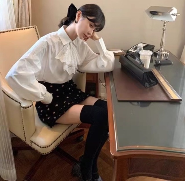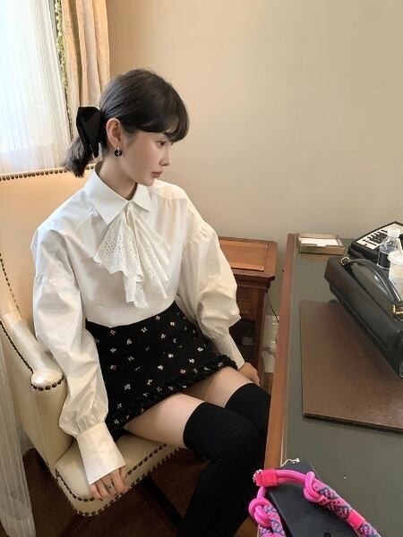 ボリューム袖に襟元のフリルレースがフェミニンな印象を与えつつ、シンプルでありながらも女性らしい上品さも演出。