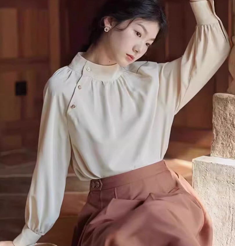 レディース シャツ ブラウス プルオーバー 長袖 カフスリーブ スタンドカラー アシンメトリー フェミニン ボタン ギャザー かわいい 大人可愛い きれいめ シンプル カジュアル 上品 おしゃれ こなれ感 抜け感 無地 春 秋 入学式 入園式 卒業式 卒園式 授業参観 オフィス ビジネス OL 通勤 学生 学校 通学 部活 デート お出かけ お泊まり 公園 女子会 休日 ガーデン ショッピング 発表会 お花見 カフェ 重ね着 コーデ 普段使い 着回し レイヤード モテ 清楚 S M ゆったり ベージュ