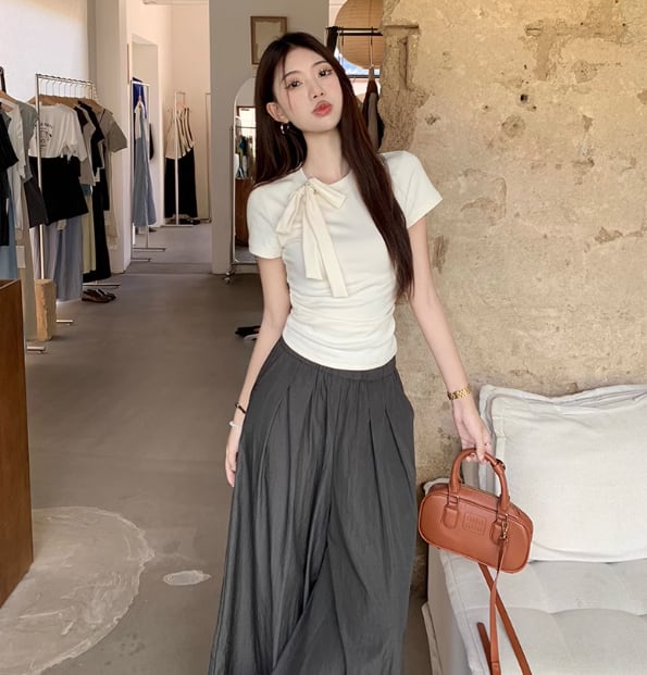 レディース トップス パンツ ボトムス セットアップ ガウチョパンツ Tシャツ 半袖 ラウンドネック スリム 細身 ストレート タック リボン ハイウエスト かわいい 大人可愛い きれいめ シンプル 上品 おしゃれ こなれ感 クール 主役級 存在感 都会的 ロマンティック 無地 春 夏 ママ 通勤 学生 学校 通学 部活 デート お出かけ イベント 旅行 女子会 美脚 脚長 普段使い 着回し モテ 清楚 インスタ映え S M L ダークグレー ベージュ