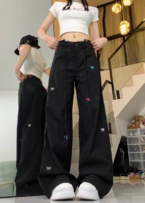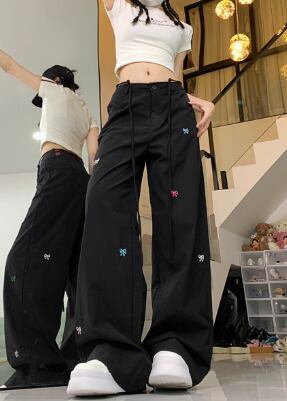 全体にリボン刺繍が施されたワイドパンツ。シンプルな中にも可愛らしい印象を与えてくれます。